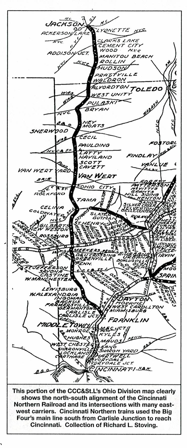One of the major acquisitions of the New York Central, in its ever-expanding quest for business, was the Cleveland, Cincinnati, Chicago and St. Louis Railway (CCC&St.L), otherwise known as the Big Four. One of its sub unit bricks was the Cincinnati Northern (reporting marks NOR). Itself a compilation of a number of even smaller bricks, it ran some 214 miles in a northerly direction from Cincinnati, Ohio to Jackson, Michigan. Except for the Detroit Toledo & Ironton, it was the only north-south road in western Ohio. Songs celebrate the legends of Casey Jones, Kate Shelley, John Henry, Old 97, the Wabash Cannon Ball, and others, but no songs have been written yet about the Cincinnati Northern.