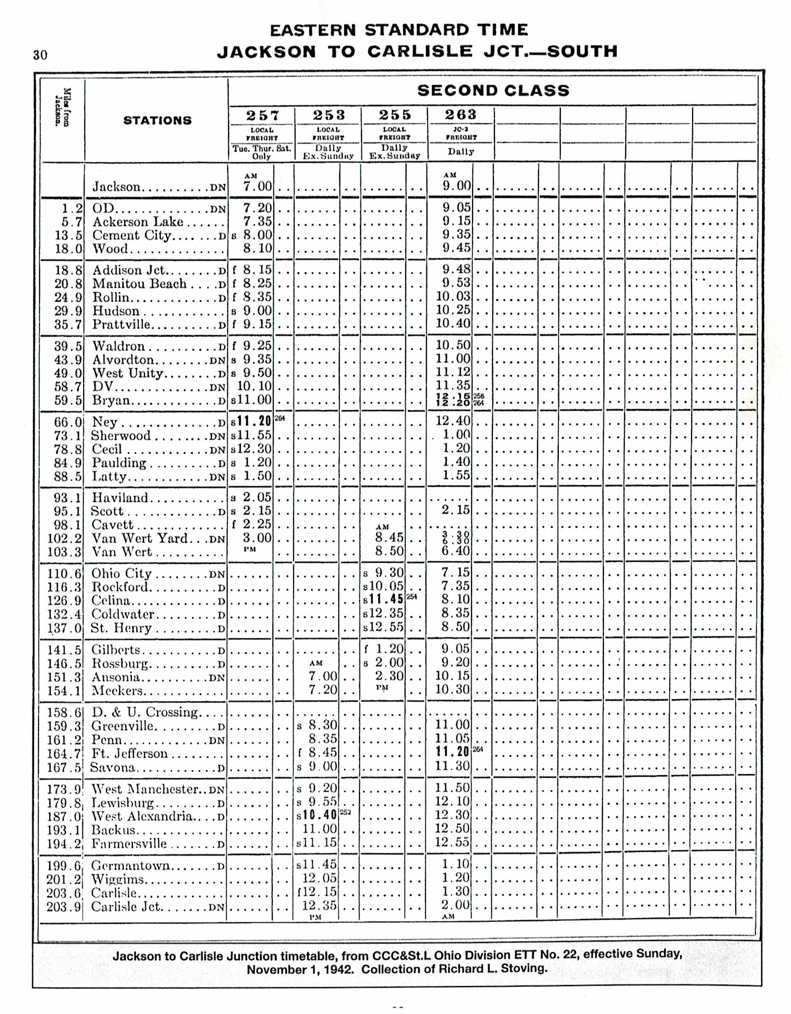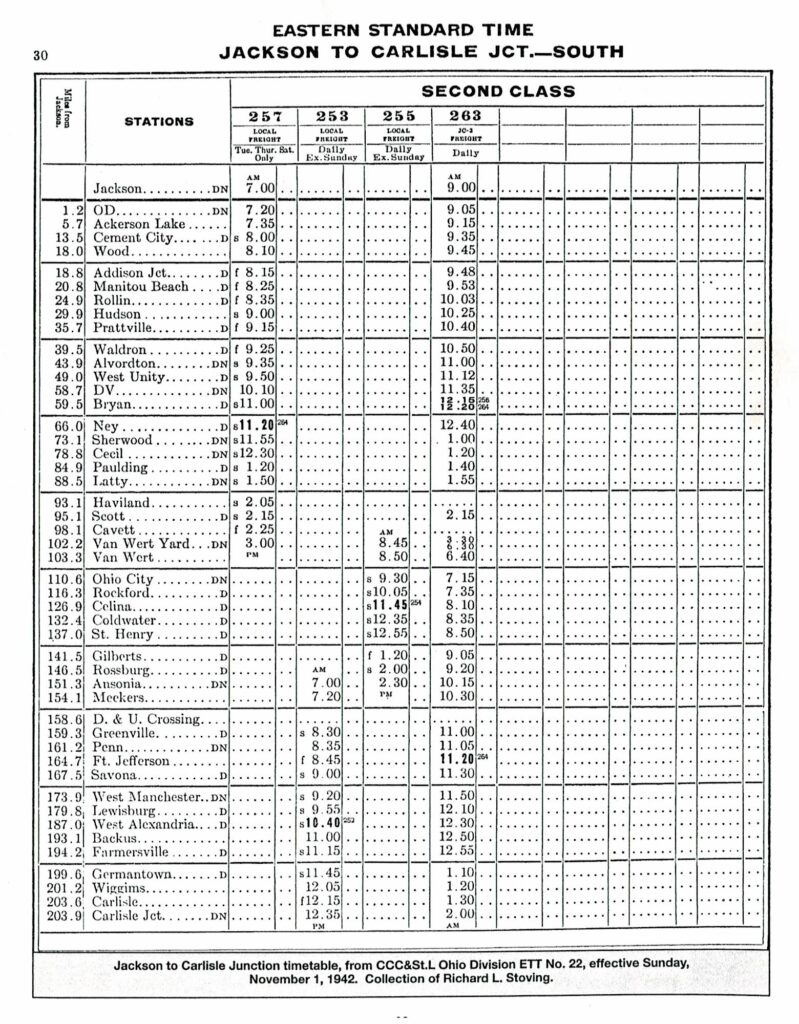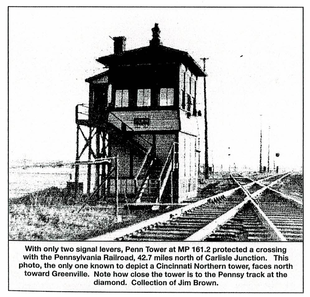 The Pennsy crossed the CN at Van Wert. It was the Pittsburgh, Ft. Wayne, and Chicago line. Van Wert was the site of the main offices, a large freight house, a large roundhouse, and a back shop, as well as a ten-track yard and a large man-made lake to supply water for the locomotives .In the north, the CN used the Michigan Central facilities at Jackson, and in the south it joined the Big Four Main at Carlisle Junction for the run to Cincinnati.