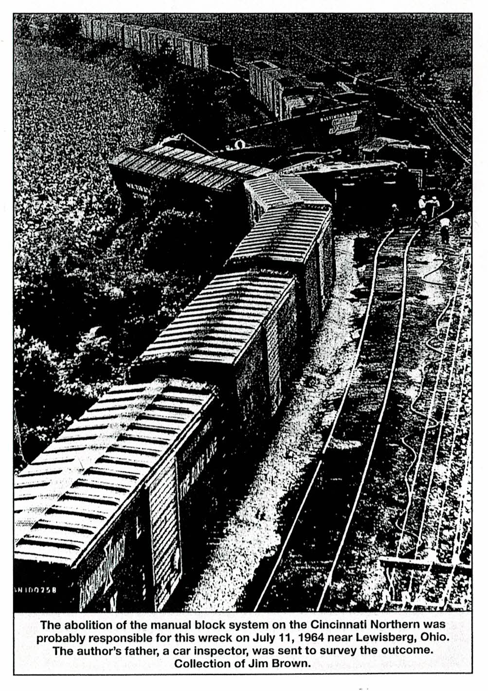 In the closing days of operation, some “brass” somewhere decided to abolish the manual block system on the CN. Soon thereafter a cornfield meet, near Lewisberg, resulted in a major pile-up. My dad, a car inspector, was sent to survey the mess. I do not know what changes, if any, came about thereafter.