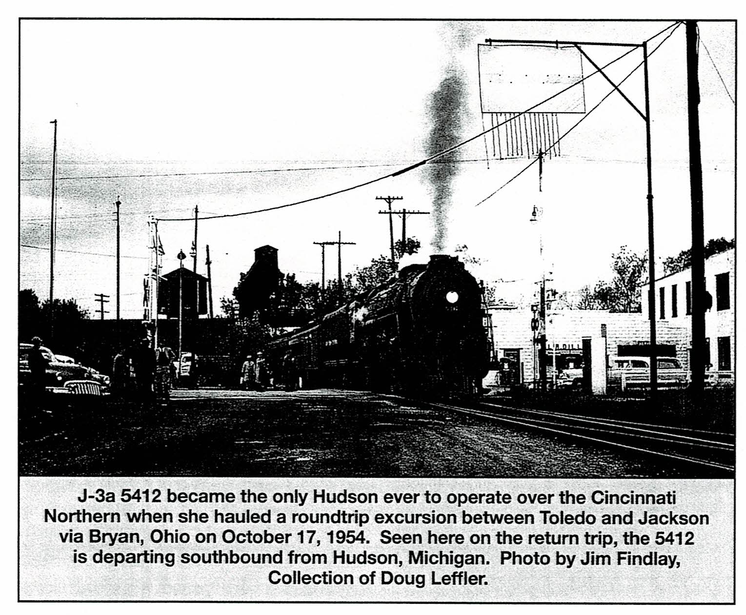 Motive power on the Cincinnati Northern began with American-type 4-4-0s and progressed to Ten Wheeler’s (4-6-0s) and then Mikados (2-8-2s) in classes H-5, H-6, and H-7. The last steam run on the Northern was behind an H-6. The only time a 4-6-4 Hudson appeared was when J-3a 5412 pulled an excursion train from Toledo to Jackson. It came off the NYC main at Bryan, Ohio and traveled north. It reversed to return. A NYC 4-8-2 Mohawk made only one trip on the NOR, running from Cincinnati to Van Wert and returned, but it was found that the CN’s 90-pound rail was too light. The Nickel Plate occasionally detoured a 2-8-4 Berkshire over the northern part of the line. Since the NOR was a north-south line, it crossed many foreign roads, some more than once. Whenever an NICP move appeared likely, there was a scramble to be the pilot, since the Berkshires were considered to be very smooth-riding locomotives. Bob Foster, the train master, usually won. There is no record of a Niagara ever making an appearance on the Cincinnati Northern.