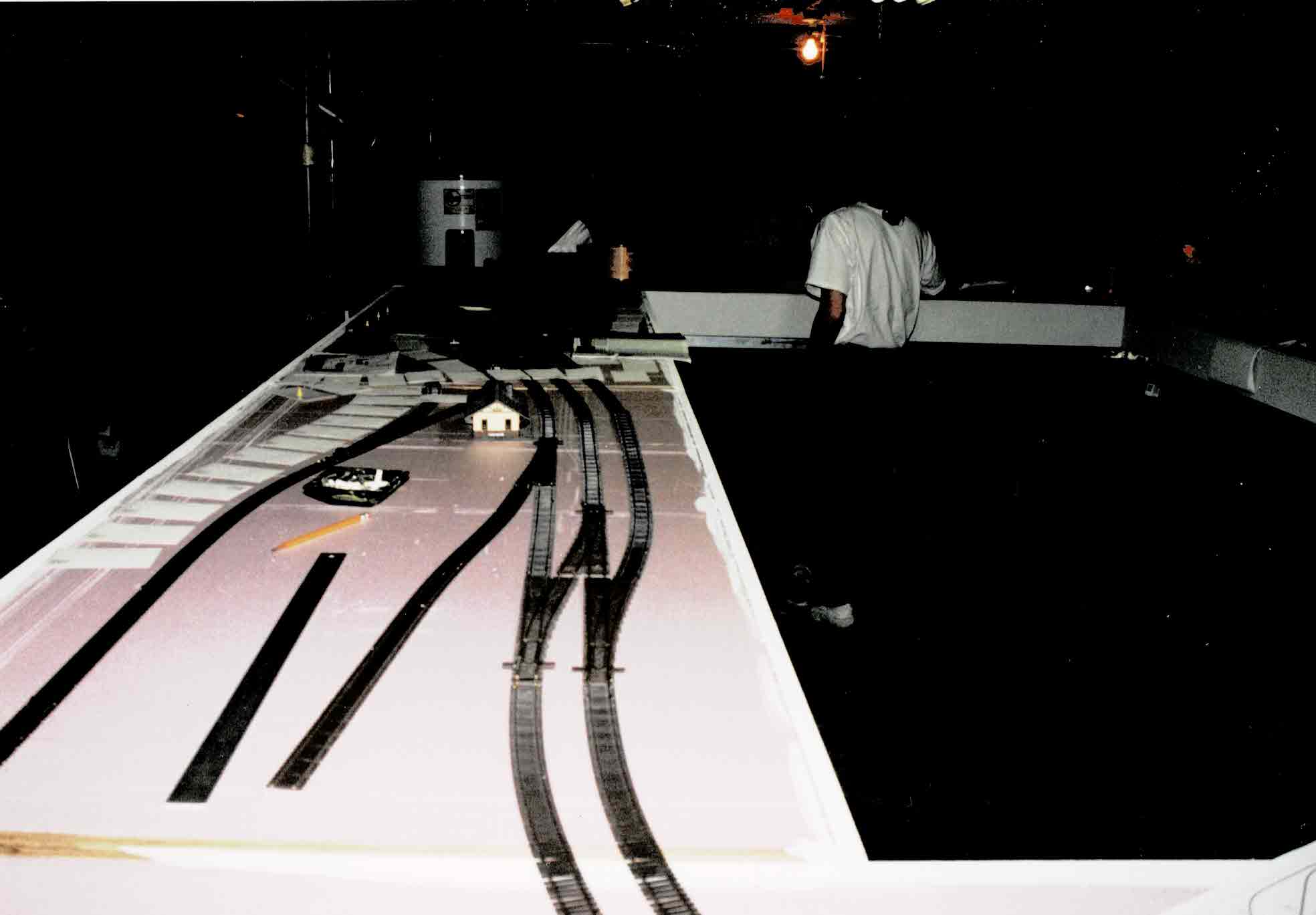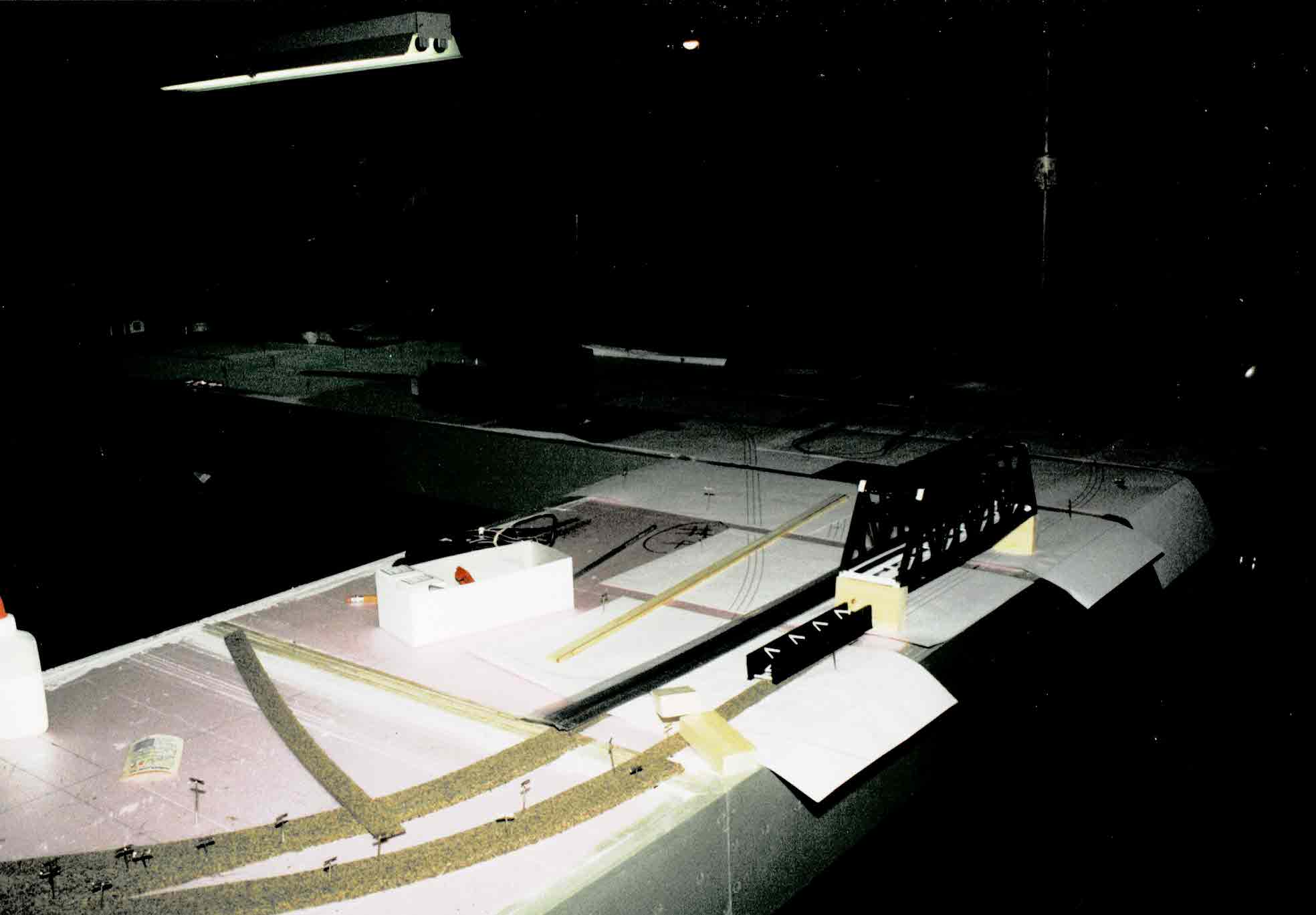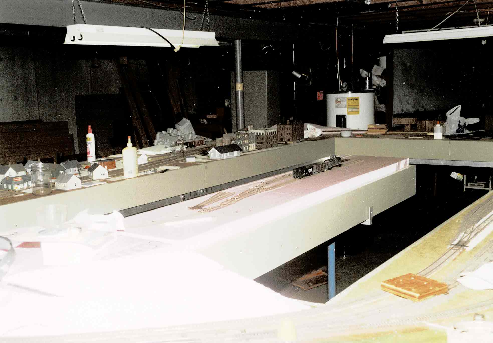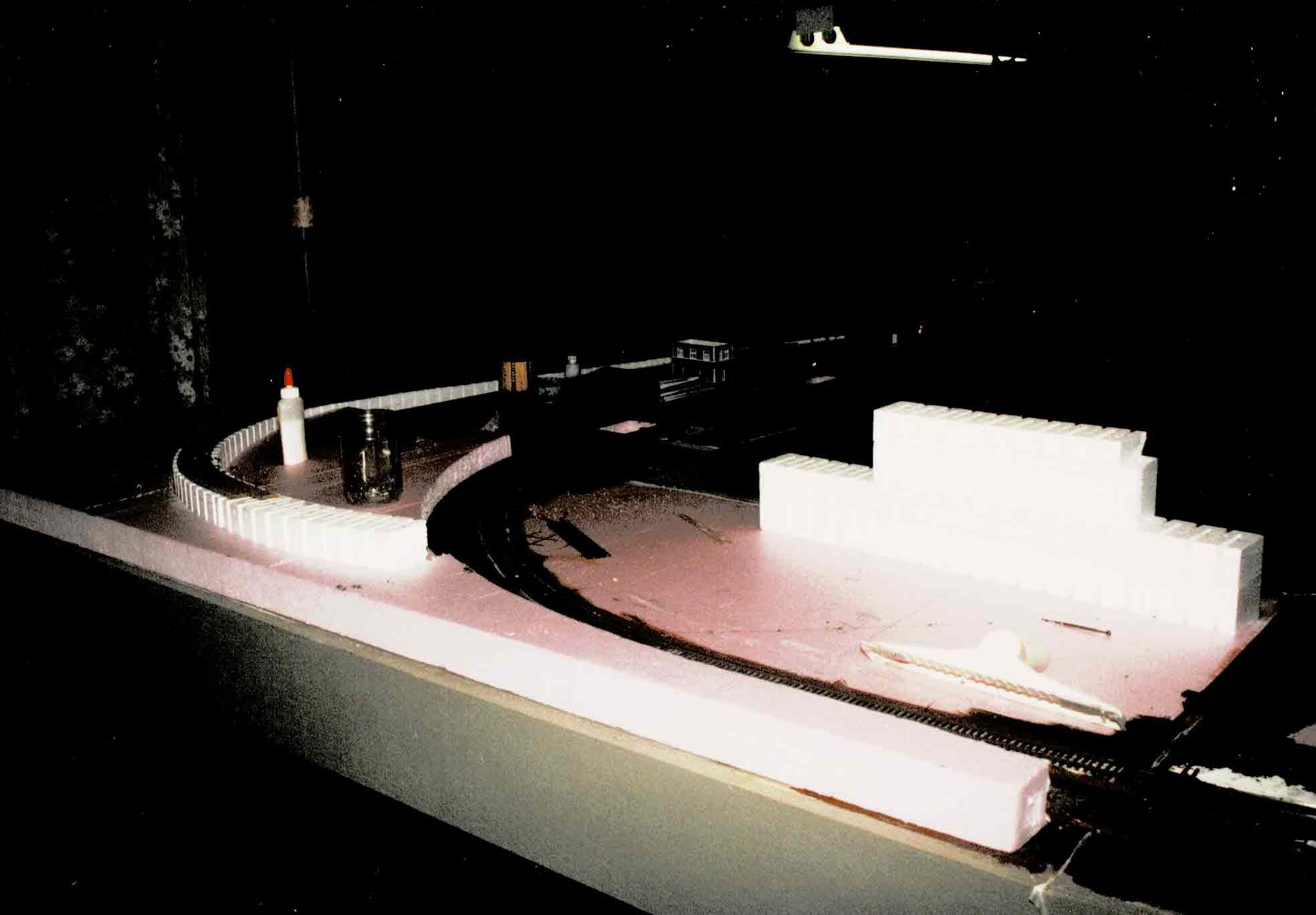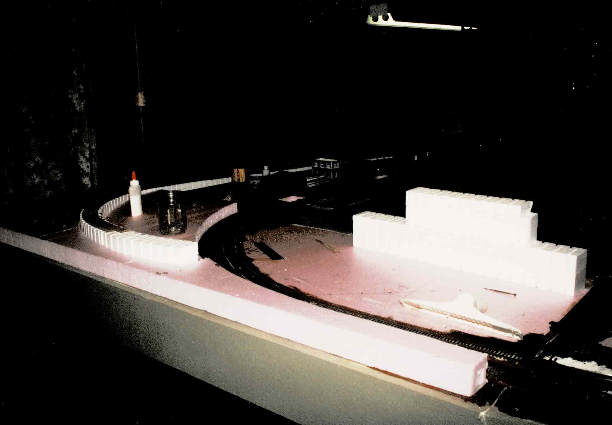 THESE ARE CONSTRUCTION PHOTOS OF THE CLUBS TRAVELING LAYOUT. THE TRACK PLAN IS BASED ON A LAYOUT IN AN OLD ATLAS LAYOUT PLANNING BOOK. THE LAYOUT AS CAN BE SEEN RESTS ON TRIPODS. THE HEIGHT OF THE LAYOUT IS ADJUSTABLE THROUGH ABOUT A 30 INCH RANGE. THE TRIPODS HOLD SQUARE ALUMINUM TUBES. THE LAYOUT RESTS ON THESE TUBES, BUT IS NOT ATTACHED TO THEM. THE LAYOUT IS MADE OF 6 INCH DEEP BOXES HOLDING A 4 INCH THICK LAYER OF EXTRUDED STYEROFOAM. THE TRACK IS GLUED TO THE STYROFOAM WITH WATER BASED CONSTRUCTION ADHESTIVE. ONE SCRATCH BUILT’ BRIDGE IS ON THE LAYOUT, THE TRESTLE CROSSING OVER THE DOUBLE TRACK MAIN LINE. ALL OTHER STRUCTURES ARE KITS WITH MODIFICATIONS.