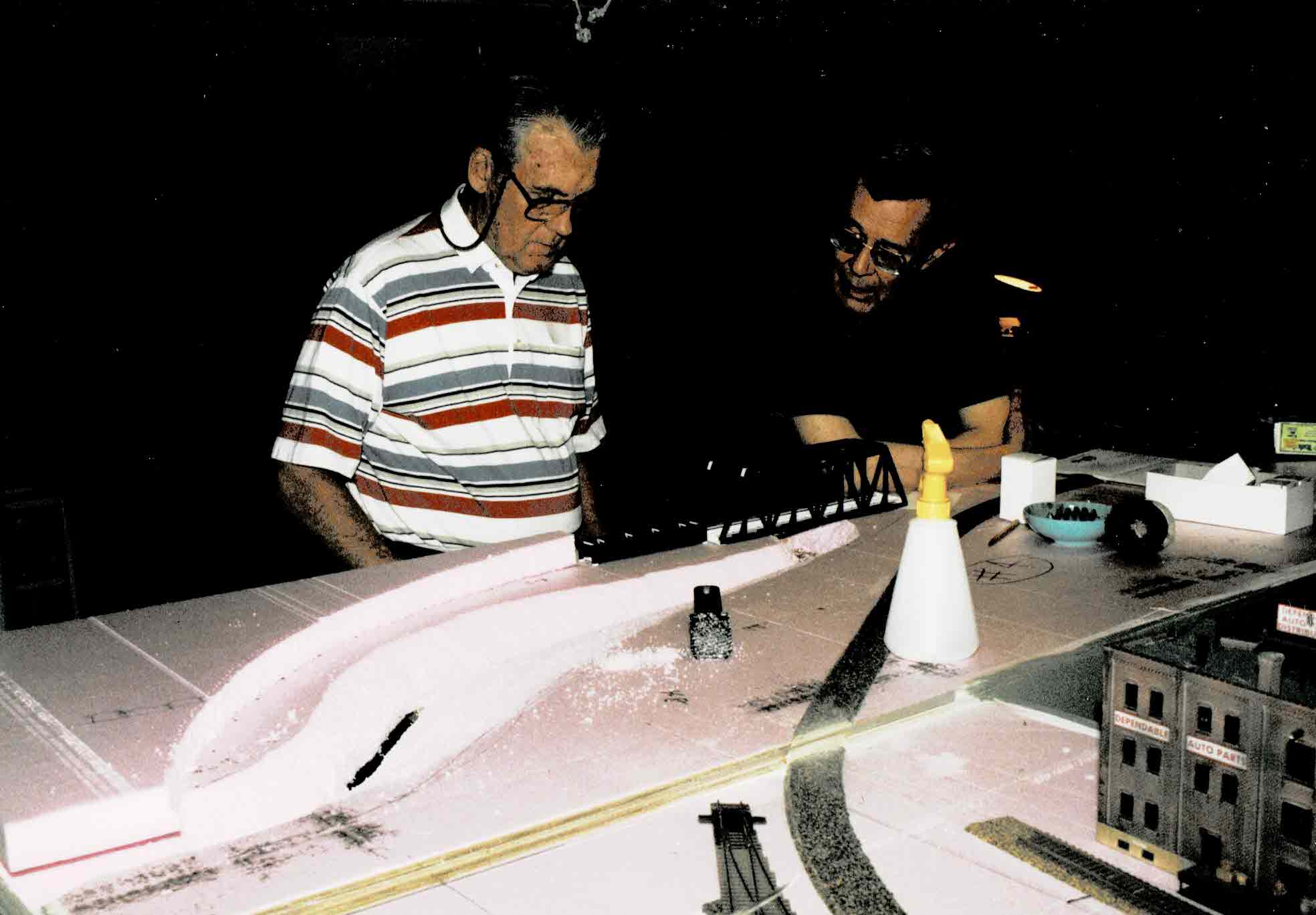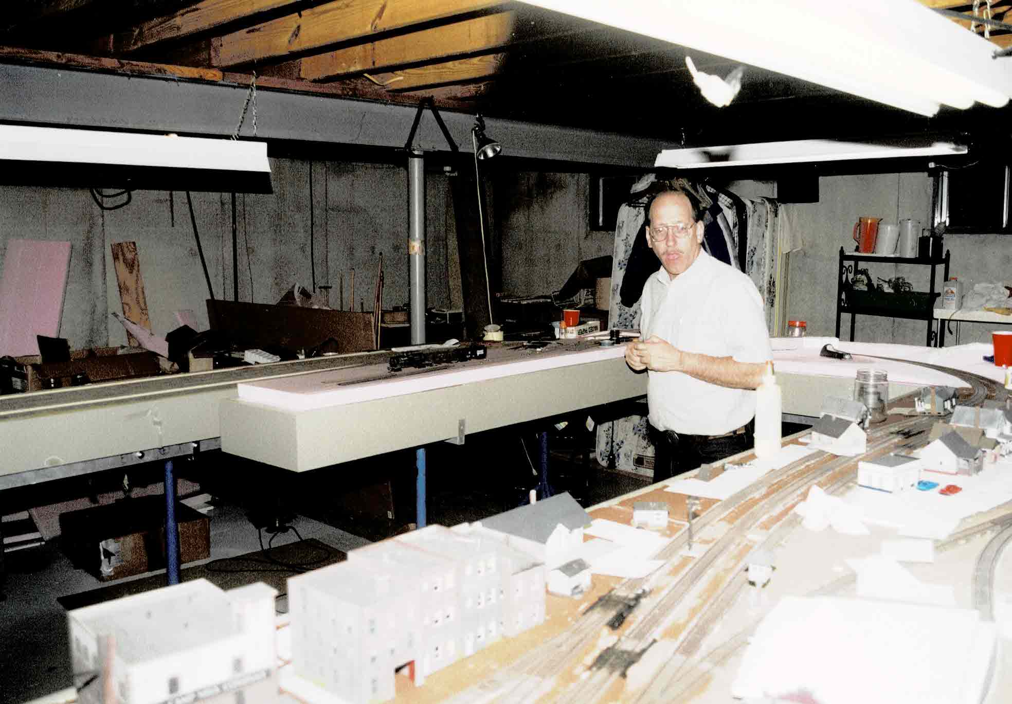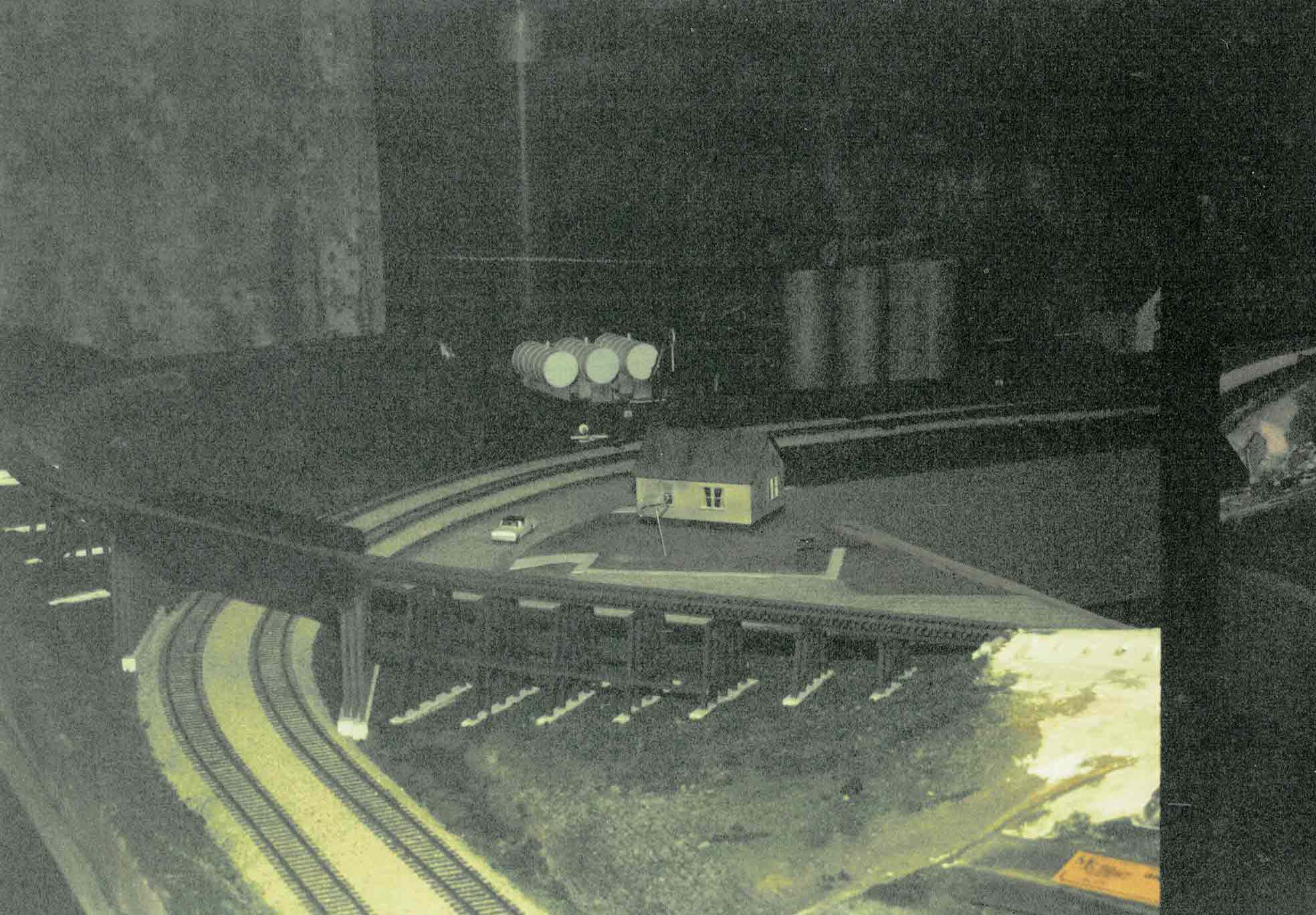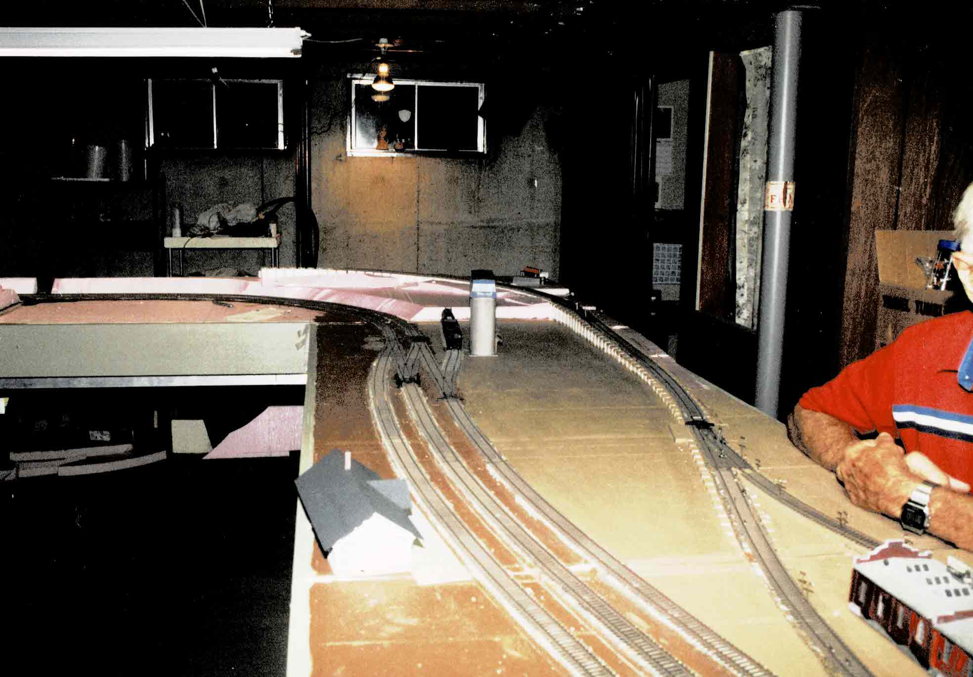 THESE ARE CONSTRUCTION PHOTOS OF THE CLUBS TRAVELING LAYOUT. THE TRACK PLAN IS BASED ON A LAYOUT IN AN OLD ATLAS LAYOUT PLANNING BOOK. THE LAYOUT AS CAN BE SEEN RESTS ON TRIPODS. THE HEIGHT OF THE LAYOUT IS ADJUSTABLE THROUGH ABOUT A 30 INCH RANGE. THE TRIPODS HOLD SQUARE ALUMINUM TUBES. THE LAYOUT RESTS ON THESE TUBES, BUT IS NOT ATTACHED TO THEM. THE LAYOUT IS MADE OF 6 INCH DEEP BOXES HOLDING A 4 INCH THICK LAYER OF EXTRUDED STYEROFOAM. THE TRACK IS GLUED TO THE STYROFOAM WITH WATER BASED CONSTRUCTION ADHESTIVE. ONE SCRATCH BUILT’ BRIDGE IS ON THE LAYOUT, THE TRESTLE CROSSING OVER THE DOUBLE TRACK MAIN LINE. ALL OTHER STRUCTURES ARE KITS WITH MODIFICATIONS.