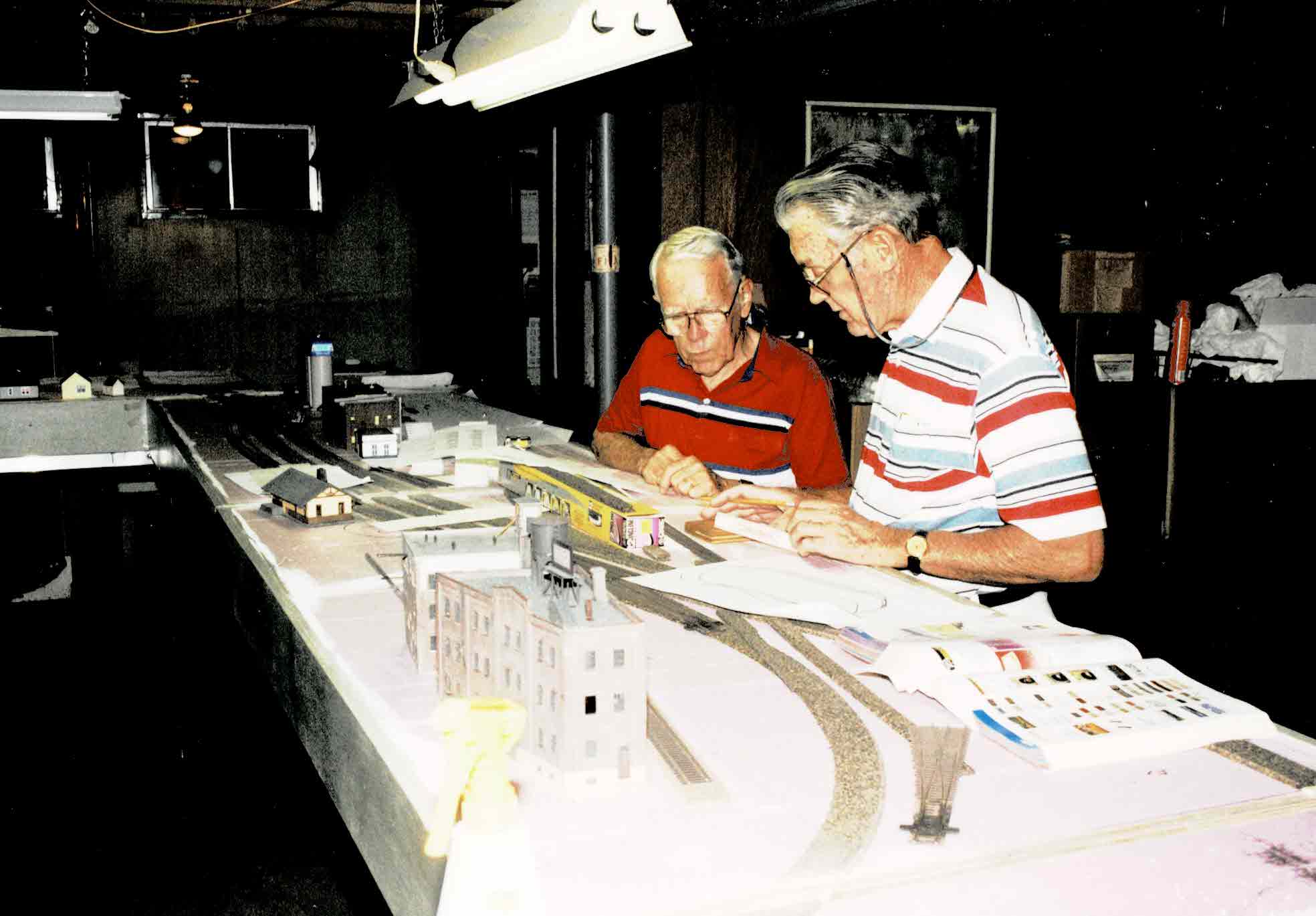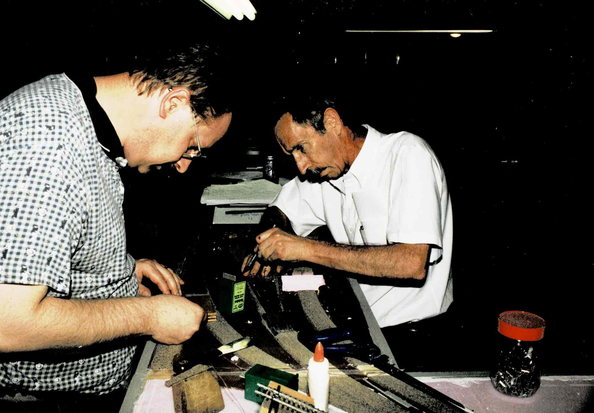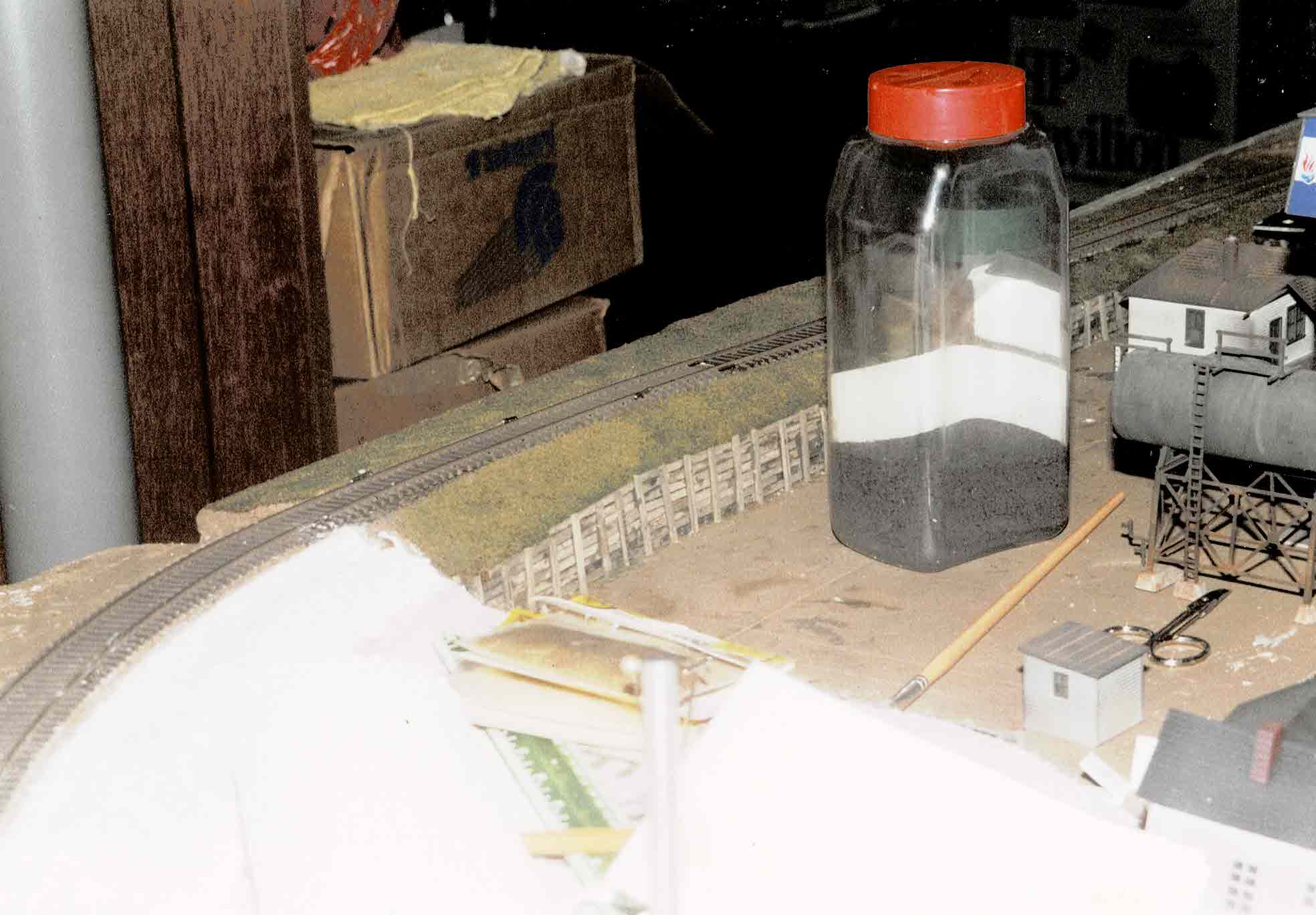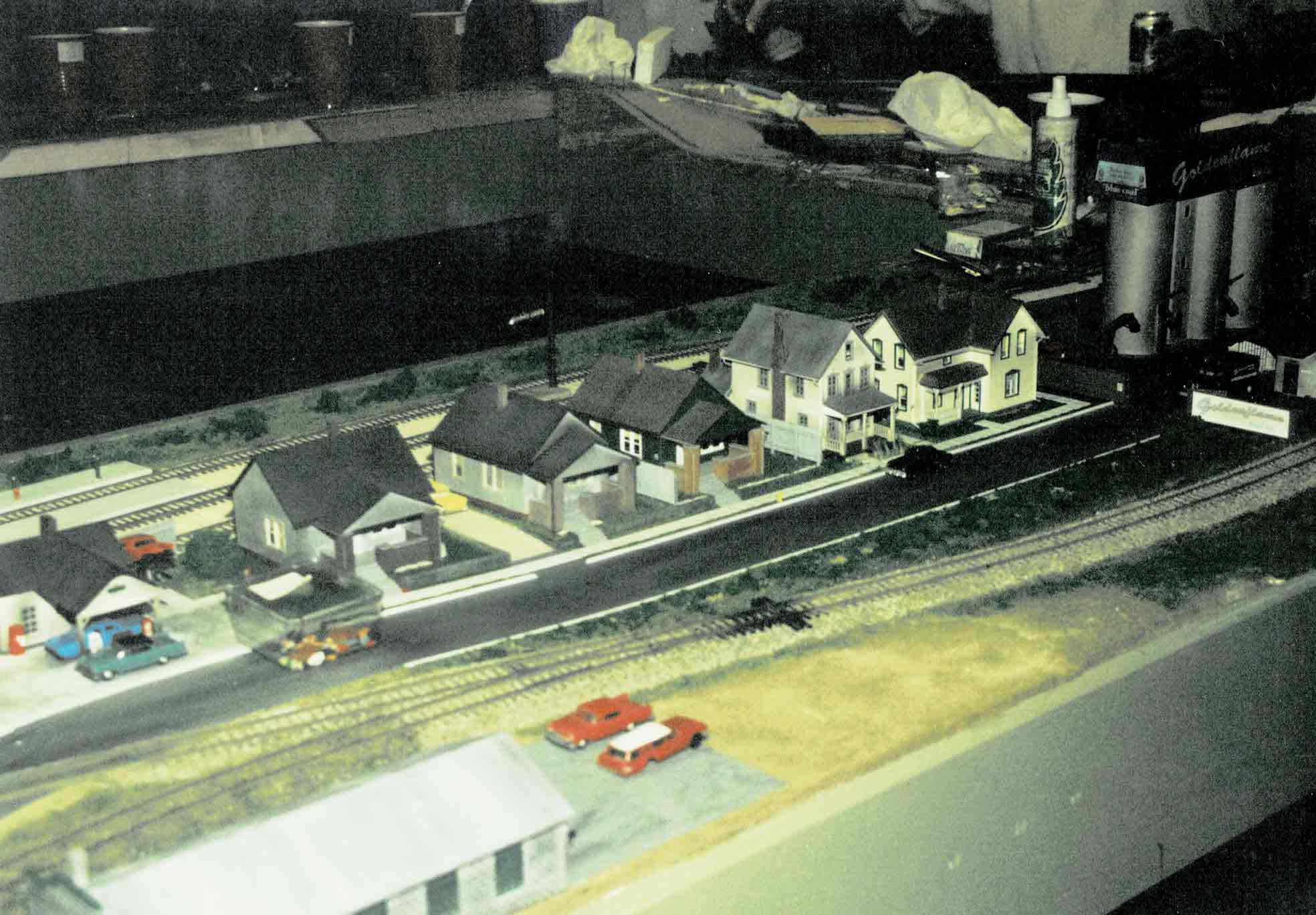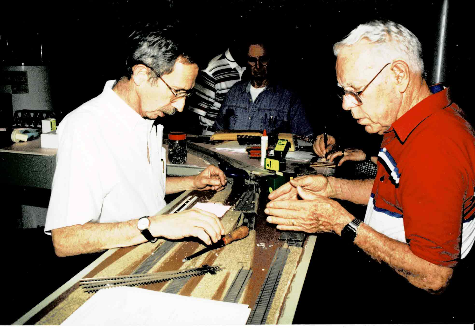 THESE ARE CONSTRUCTION PHOTOS OF THE CLUBS TRAVELING LAYOUT. THE TRACK PLAN IS BASED ON A LAYOUT IN AN OLD ATLAS LAYOUT PLANNING BOOK. THE LAYOUT AS CAN BE SEEN RESTS ON TRIPODS. THE HEIGHT OF THE LAYOUT IS ADJUSTABLE THROUGH ABOUT A 30 INCH RANGE. THE TRIPODS HOLD SQUARE ALUMINUM TUBES. THE LAYOUT RESTS ON THESE TUBES, BUT IS NOT ATTACHED TO THEM. THE LAYOUT IS MADE OF 6 INCH DEEP BOXES HOLDING A 4 INCH THICK LAYER OF EXTRUDED STYEROFOAM. THE TRACK IS GLUED TO THE STYROFOAM WITH WATER BASED CONSTRUCTION ADHESTIVE. ONE SCRATCH BUILT’ BRIDGE IS ON THE LAYOUT, THE TRESTLE CROSSING OVER THE DOUBLE TRACK MAIN LINE. ALL OTHER STRUCTURES ARE KITS WITH MODIFICATIONS.