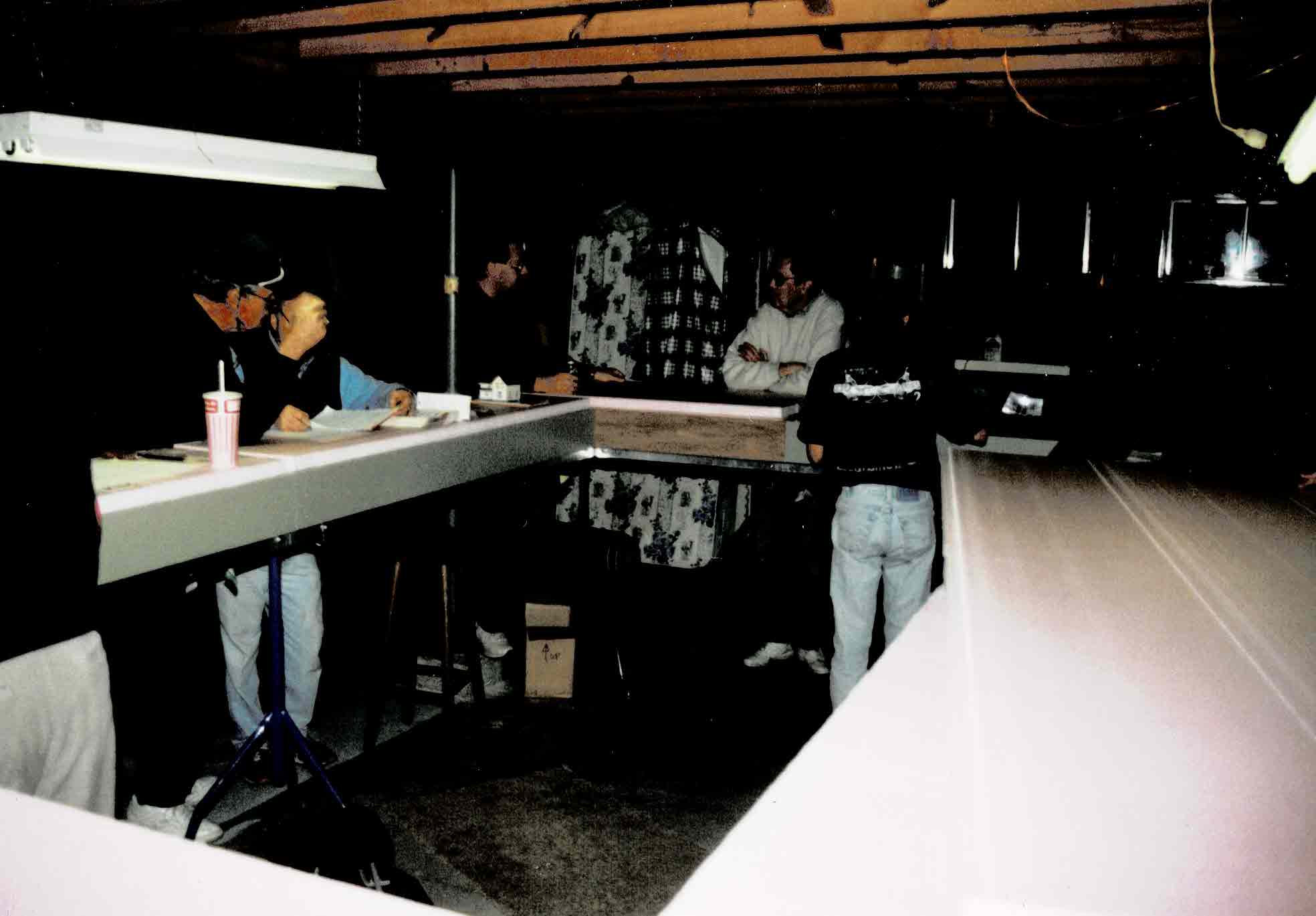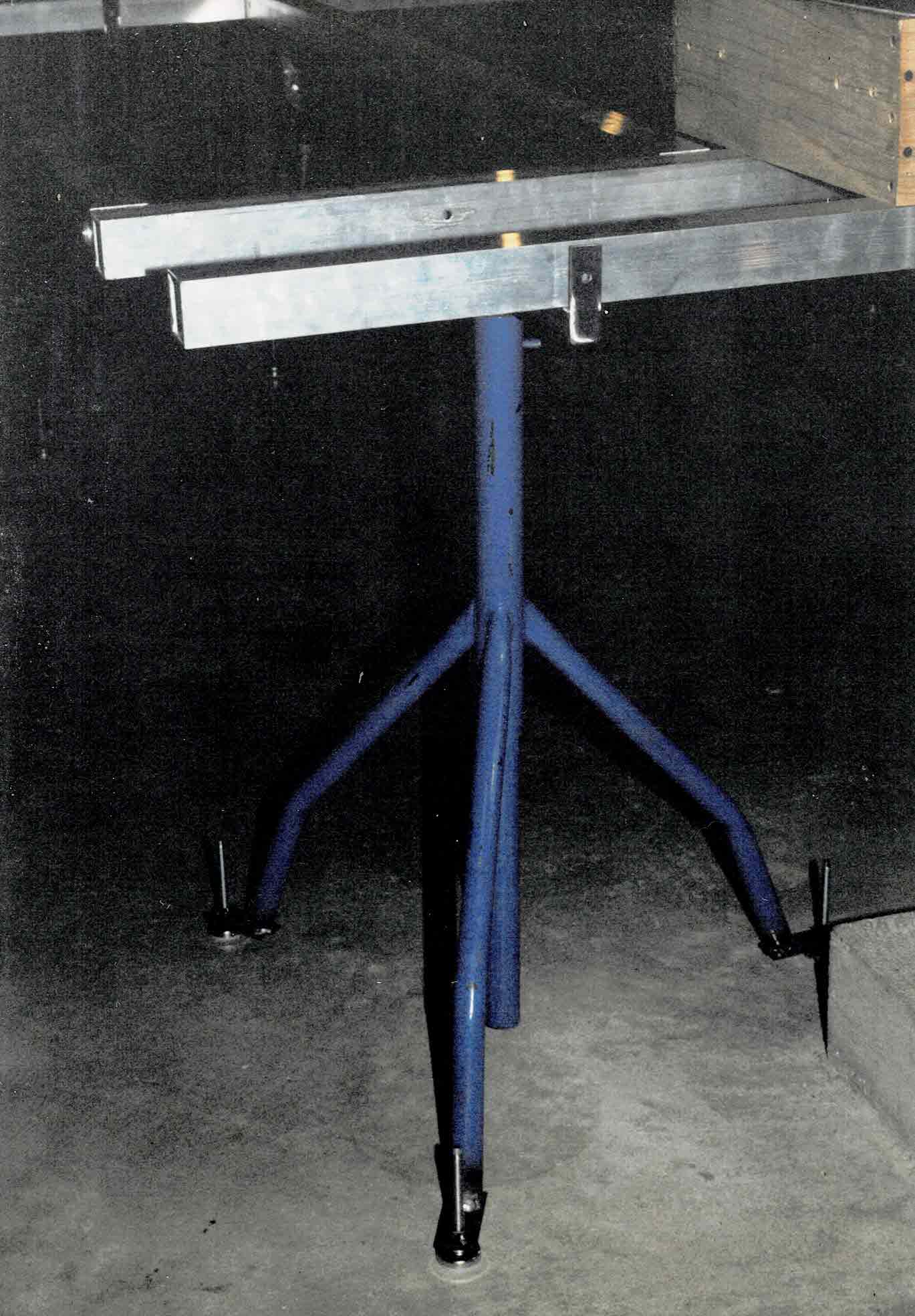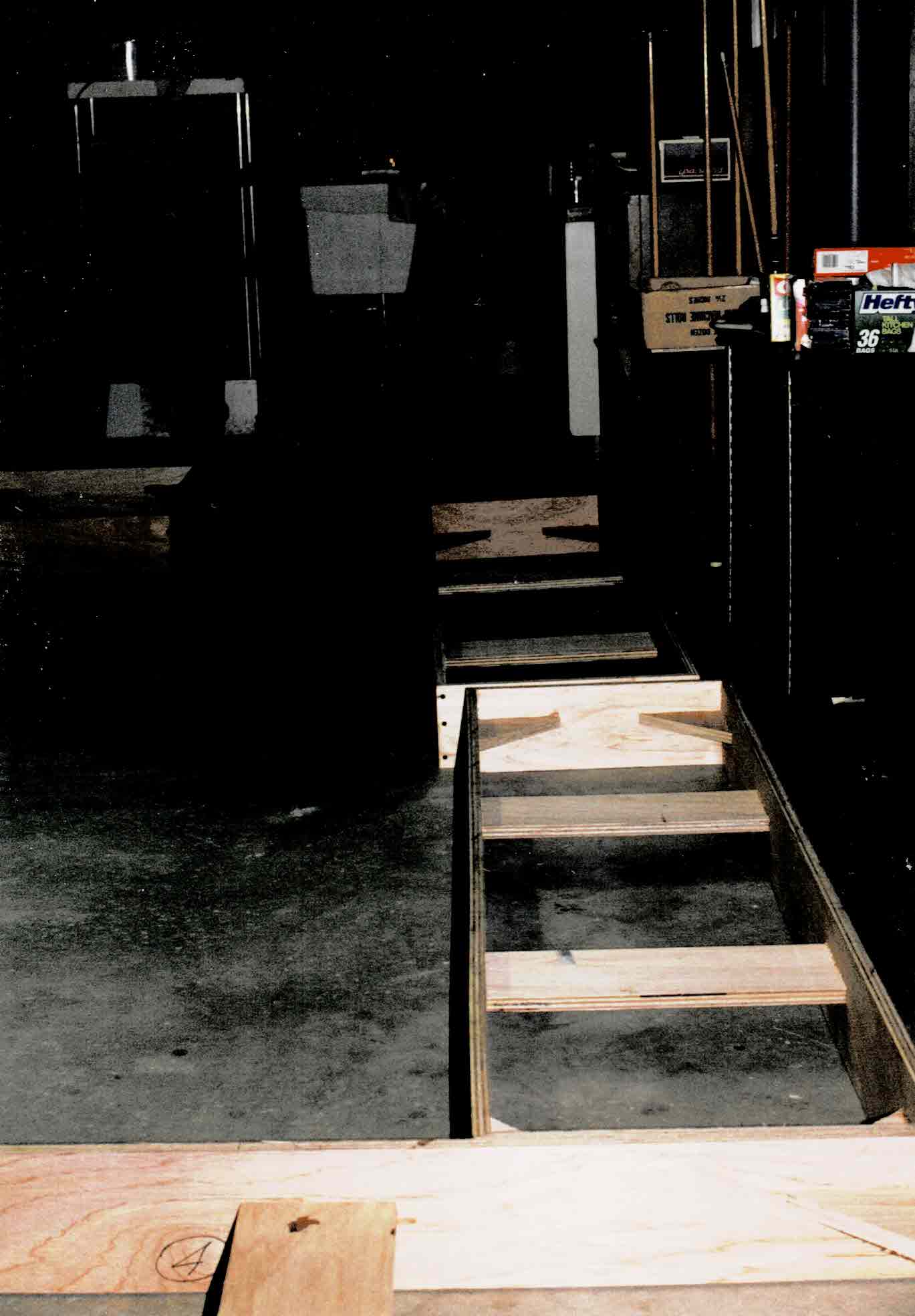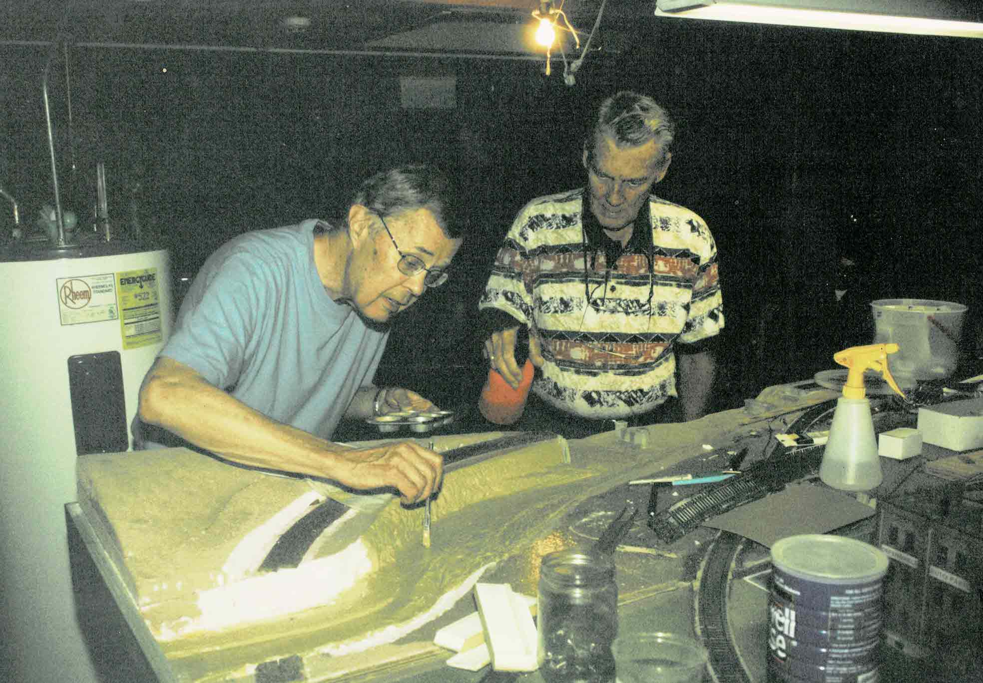 THESE ARE CONSTRUCTION PHOTOS OF THE CLUBS TRAVELING LAYOUT. THE TRACK PLAN IS BASED ON A LAYOUT IN AN OLD ATLAS LAYOUT PLANNING BOOK. THE LAYOUT AS CAN BE SEEN RESTS ON TRIPODS. THE HEIGHT OF THE LAYOUT IS ADJUSTABLE THROUGH ABOUT A 30 INCH RANGE. THE TRIPODS HOLD SQUARE ALUMINUM TUBES. THE LAYOUT RESTS ON THESE TUBES, BUT IS NOT ATTACHED TO THEM. THE LAYOUT IS MADE OF 6 INCH DEEP BOXES HOLDING A 4 INCH THICK LAYER OF EXTRUDED STYEROFOAM. THE TRACK IS GLUED TO THE STYROFOAM WITH WATER BASED CONSTRUCTION ADHESTIVE. ONE SCRATCH BUILT’ BRIDGE IS ON THE LAYOUT, THE TRESTLE CROSSING OVER THE DOUBLE TRACK MAIN LINE. ALL OTHER STRUCTURES ARE KITS WITH MODIFICATIONS.