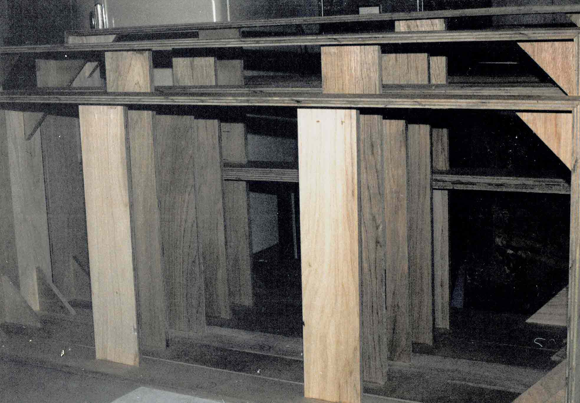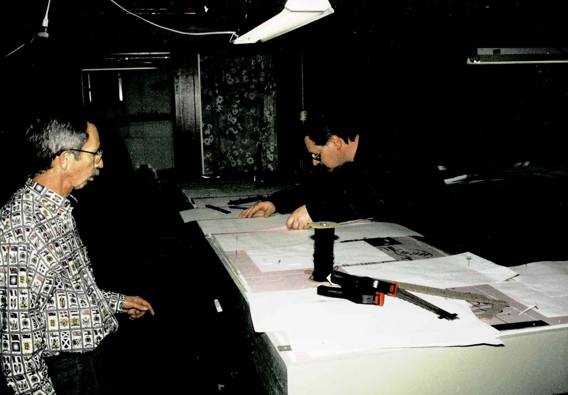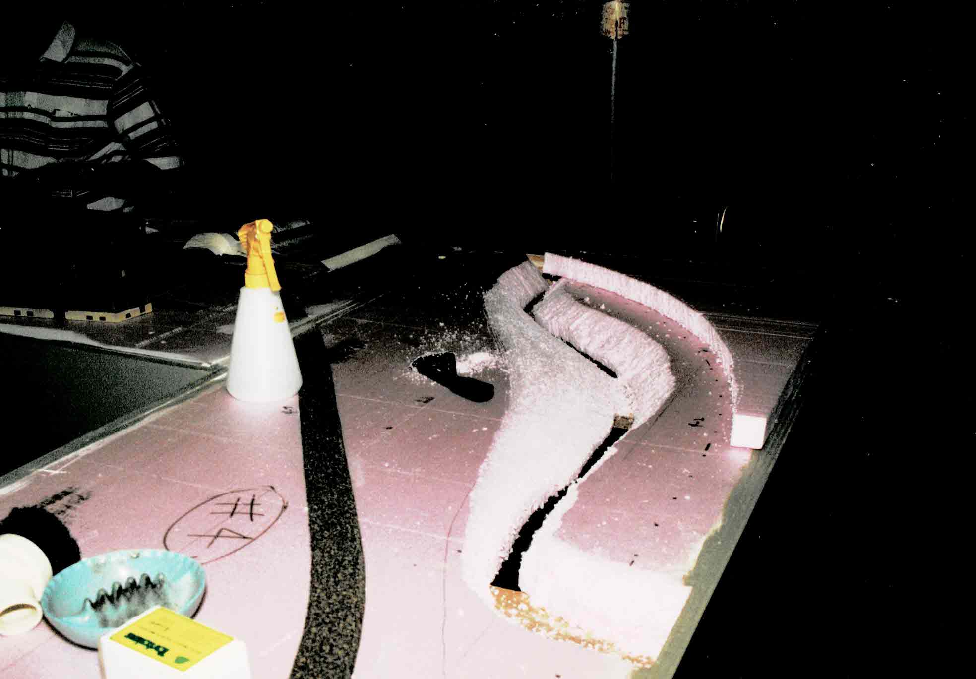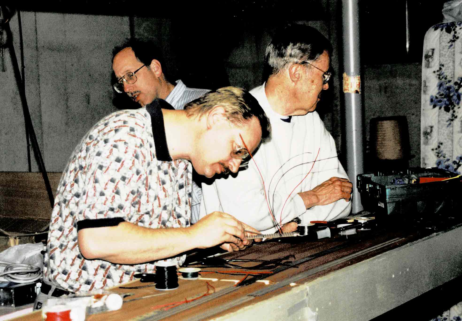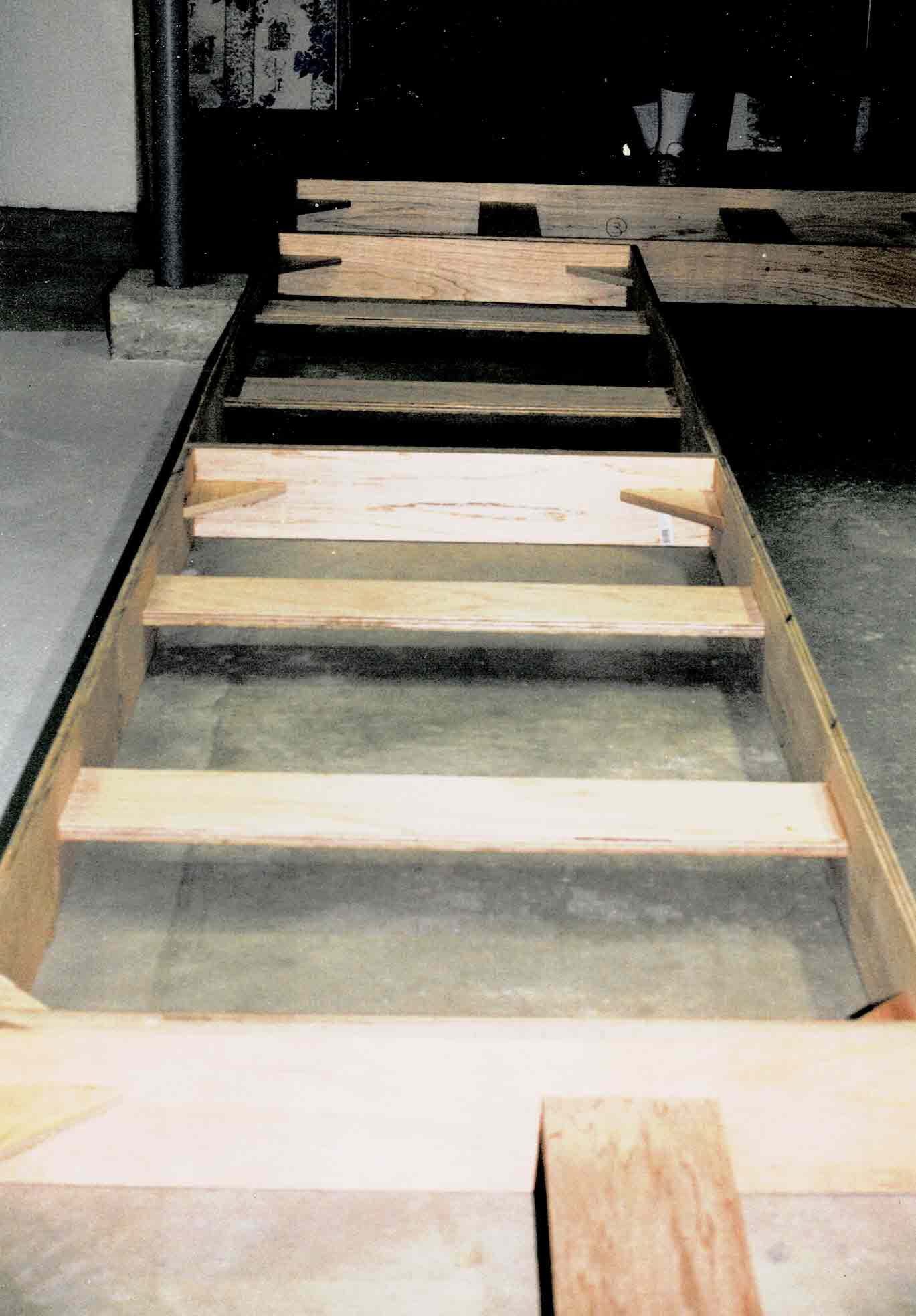 THESE ARE CONSTRUCTION PHOTOS OF THE CLUBS TRAVELING LAYOUT. THE TRACK PLAN IS BASED ON A LAYOUT IN AN OLD ATLAS LAYOUT PLANNING BOOK. THE LAYOUT AS CAN BE SEEN RESTS ON TRIPODS. THE HEIGHT OF THE LAYOUT IS ADJUSTABLE THROUGH ABOUT A 30 INCH RANGE. THE TRIPODS HOLD SQUARE ALUMINUM TUBES. THE LAYOUT RESTS ON THESE TUBES, BUT IS NOT ATTACHED TO THEM. THE LAYOUT IS MADE OF 6 INCH DEEP BOXES HOLDING A 4 INCH THICK LAYER OF EXTRUDED STYEROFOAM. THE TRACK IS GLUED TO THE STYROFOAM WITH WATER BASED CONSTRUCTION ADHESTIVE. ONE SCRATCH BUILT’ BRIDGE IS ON THE LAYOUT, THE TRESTLE CROSSING OVER THE DOUBLE TRACK MAIN LINE. ALL OTHER STRUCTURES ARE KITS WITH MODIFICATIONS.