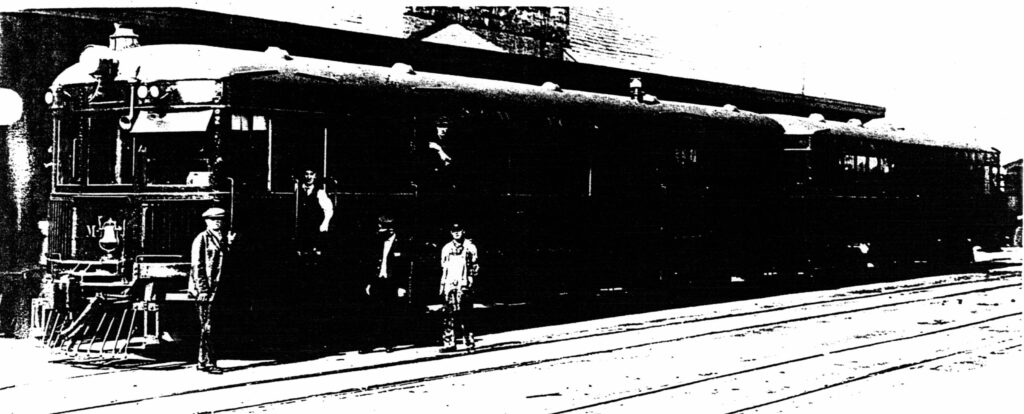 Primitive gas-electric and companion trailer built by Wason of Springfield, Mass., and General Electric in 1912. This is the earliest application of engine-electric drive that we are aware of.