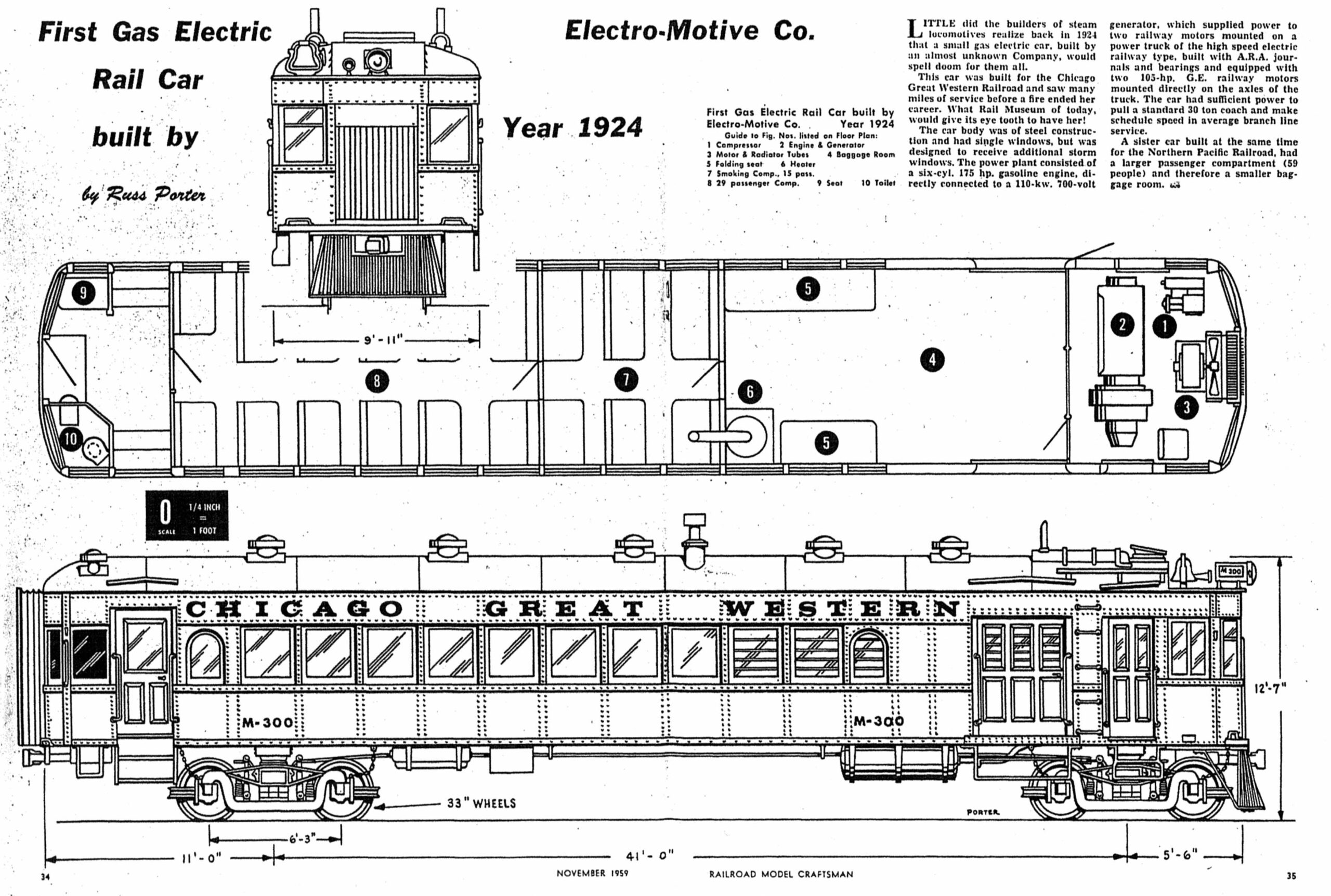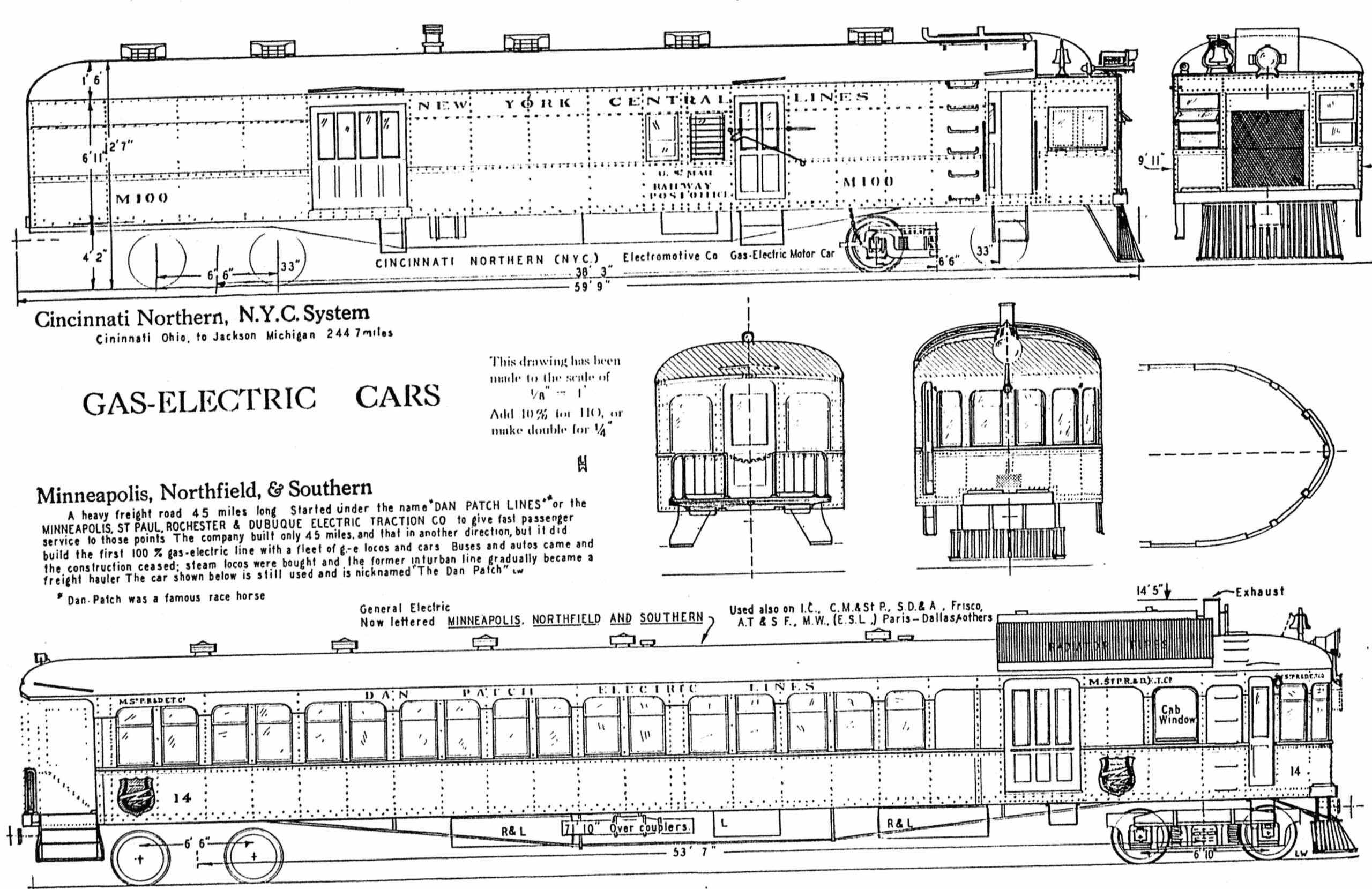 Plans reproduced here are for the Cincinnati Northern gas-electric car M-100. All four Cincinnati Northern cars were identical. This plan was first published in Model Railroader magazine in 1936. It has numerous errors, including wrong truck locations [the EMC cars had the front truck much closer to the front of the can, the location of the RPO and baggage doors and windows appears wrong based on photos. The trucks in the drawing are Brill 27 MCB, while the EMC cars had St. Louis 23 EM trucks. Rivet spacing also appears wrong. The drawing shows a fish-belly underframe, something that would not have been used on a gas- electric car, where light weight construction was required. Many other things also appear wrong.