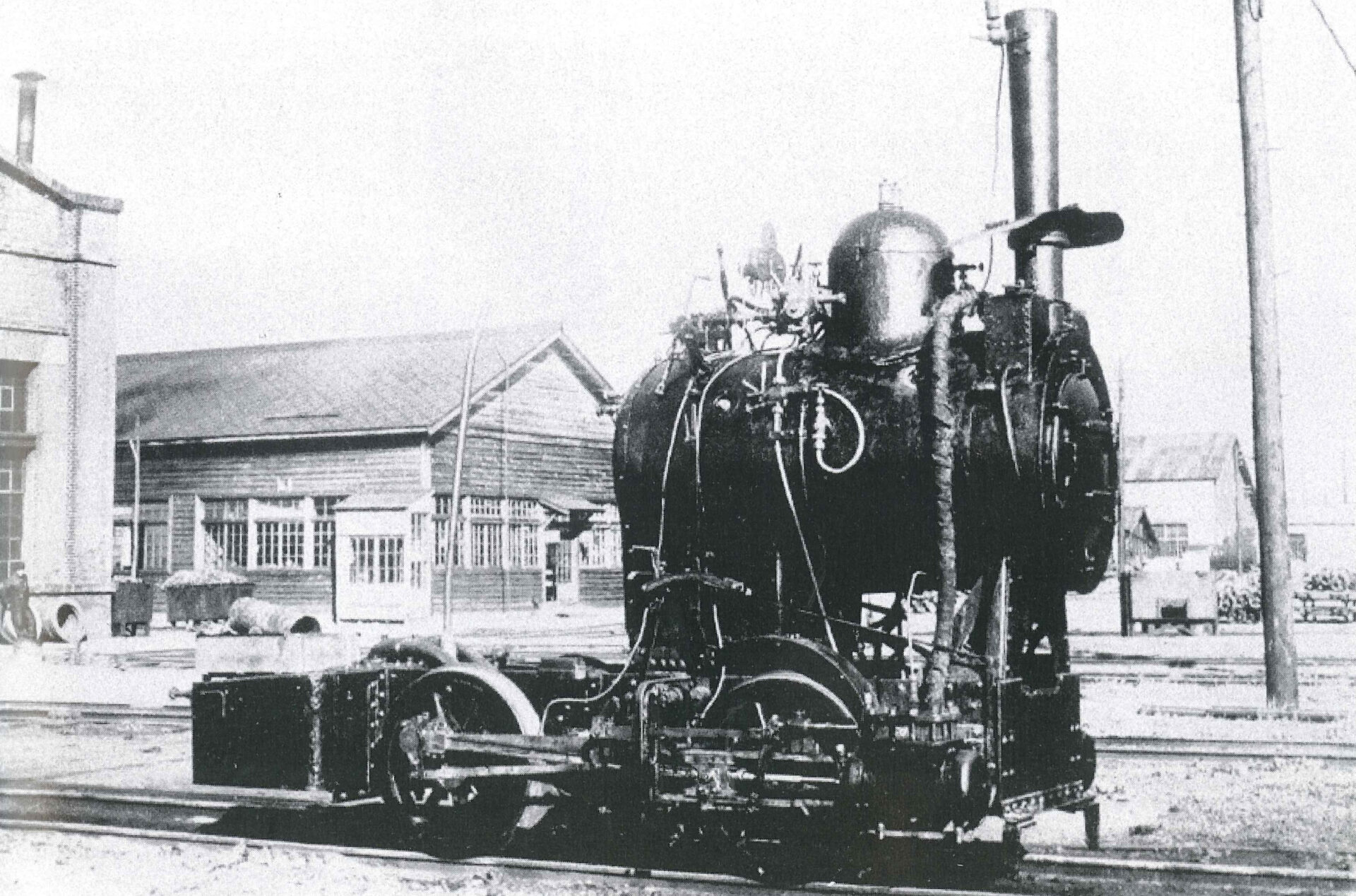 Here’s another pic of an odd piece of equipment that I have no info on. It looks like the boiler & chassis from a little 0-4-0. The cab is gone, but all the piping and gearing is in place as if it’s operable. But, there’s no fuel bin and spare water tank, and no place to stand to feed the firebox. My guess is that there is repair work taking place on the cab.
