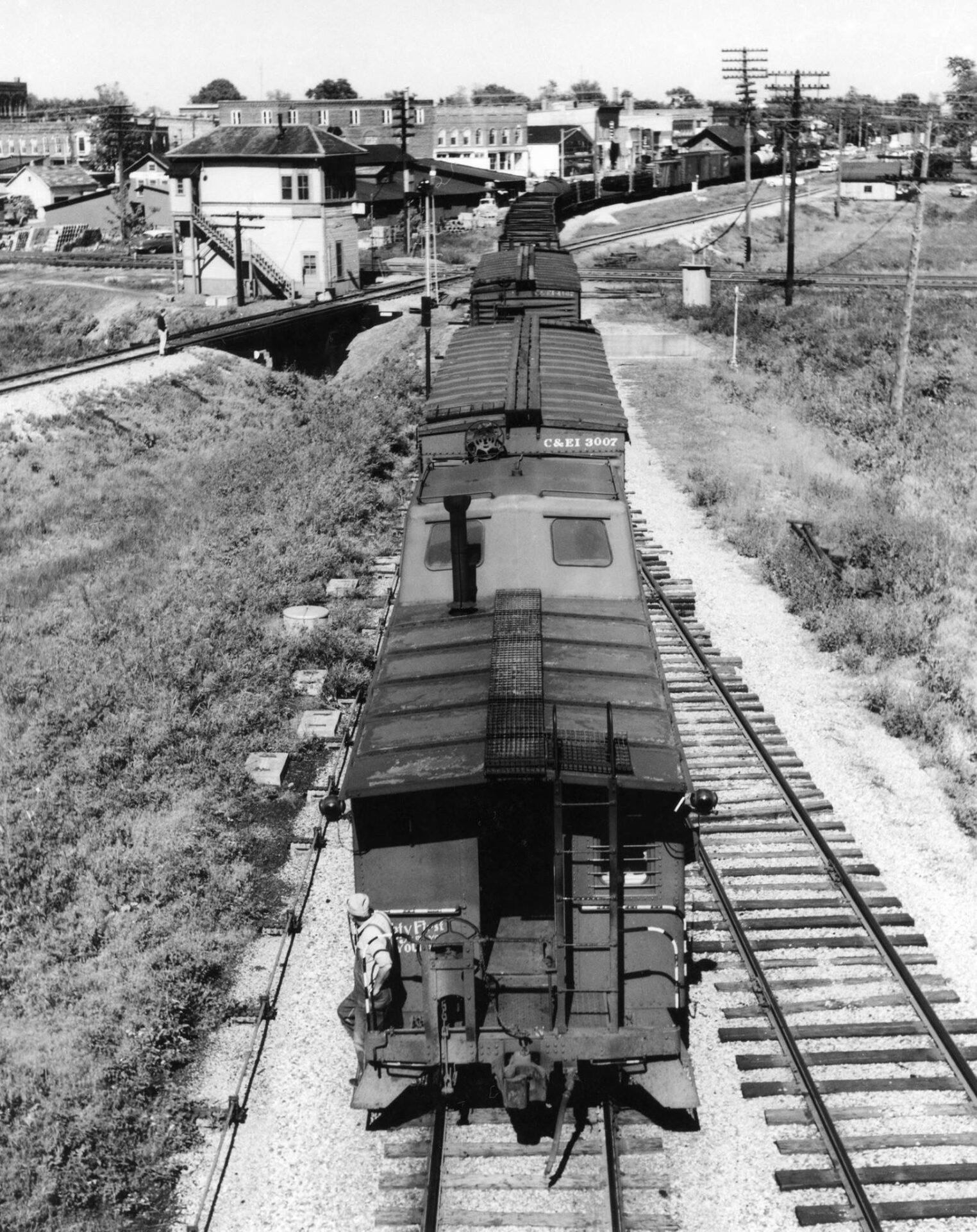 We’ll finish up with this photo – a nice view forward from the behind the train. Note the mechanical turnout/signal control rods above the ballast to the left of the train. The tower to the left of the train appears to control the intersection of the three lines. The three diamonds must be within a few yards of one another.