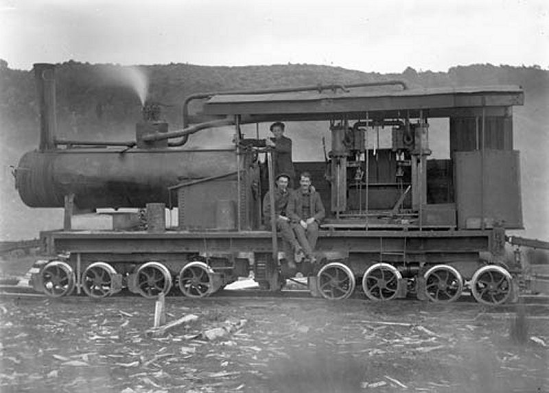If you like geared locos, here’s a Johnston 16 driver-wheeled, geared steamer built in 1910 for the Glenham Sawmilling Co. I think if I saw a model of this, I would buy it in an instant! The pistons are vertical, like a Shay, but since the drive shaft runs down the middle of the axles, you see the vertical pistons inside the extended cab. The 8 axles are divided into 4 separate trucks with universals on the drive shaft between each truck. I’m guessing now that I think the Whyte notation would be 0-4-4-4-4-0G (the end G stands for geared loco). Maybe a better notation would be 2-2+2-2+2-2+2-2! At least 16 of these geared locos were built between 1910 and 1937 (off their patent, which was issued in 1909). Was it planned to build 16 of these 16-wheeled locos? The average life of one of these was 23 years, but none were preserved. Unfortunately, I’d have a difficult time putting them on my layout, even if I built a logging railroad. These were built and operated in New Zealand.