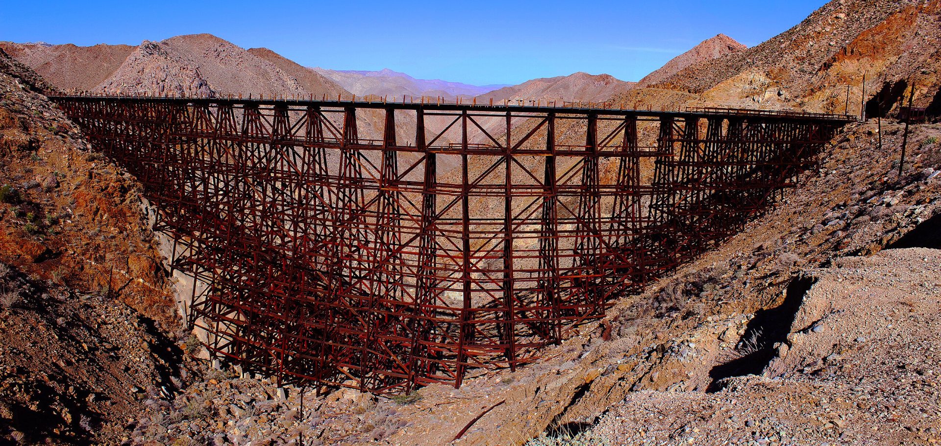 Most modelers love a good trestle. And most of us can squeeze a small trestle—or maybe a couple of small bents—on our railroad. But our love is for something the size of this. This wood trestle is the Goat Canyon Trestle in San Diego County, California. At a length of 597–750 feet, it is the world’s largest all-wood trestle (I think that’s currently existing). Goat Canyon Trestle was built in 1933 as part of the San Diego and Arizona Eastern Railway after one of the many tunnels through the Carrizo Gorge collapsed.