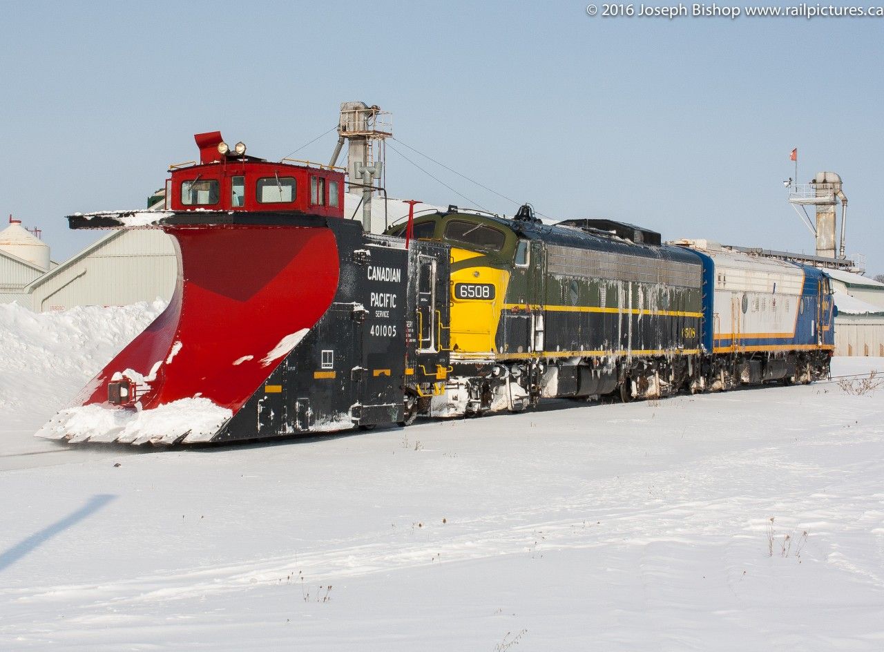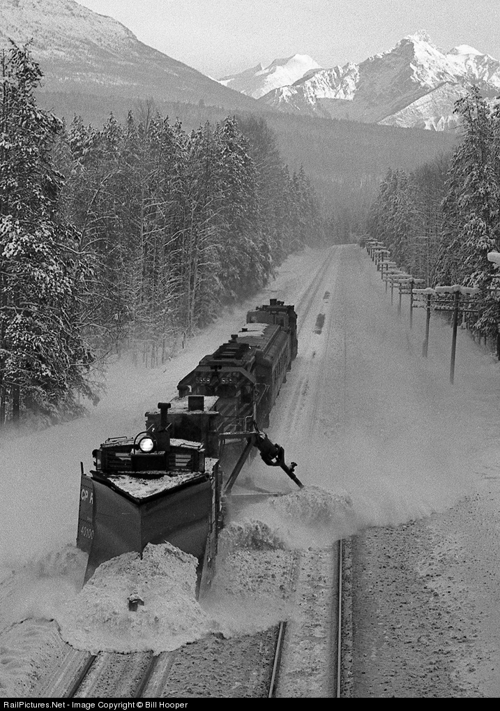 Here’s a snow plow with a spreader arm to further push the snow aside. The photo is of the Canadian Pacific plow extra in British Columbia, 1974. The locomotive is a GMD SD-40.