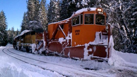This is a Jordan Spreader clearing snow at Donner’s Pass. Snow drifts can reach 20’ high up in the pass. Looks like the extended blades are pulled in.