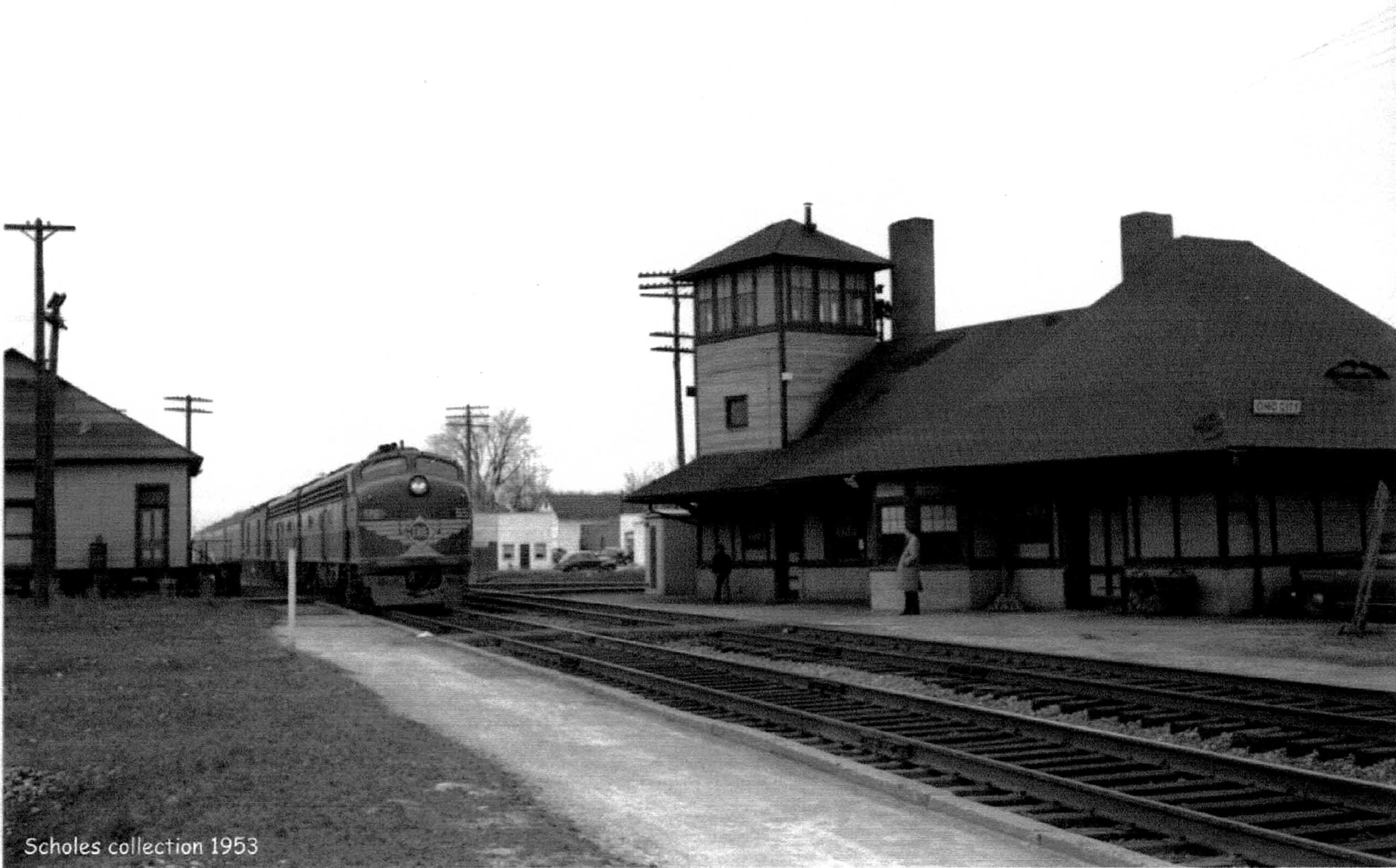 This is a 1953 shot of the station from the other side (southeast corner) of the station. Crossing the CNor is a pair of Erie F-units pulling what appears to be a passenger train up to the station. During this era, the crossing tower is integrated into the end of the station. Later, the tower was removed from the station (see previous pics). And I believe earlier than this era, the tower was a separate structure beyond the station. Check out the concrete booth at the corner next to the tower – this likely houses a phone tied directly to the dispatchers office for crew communication.