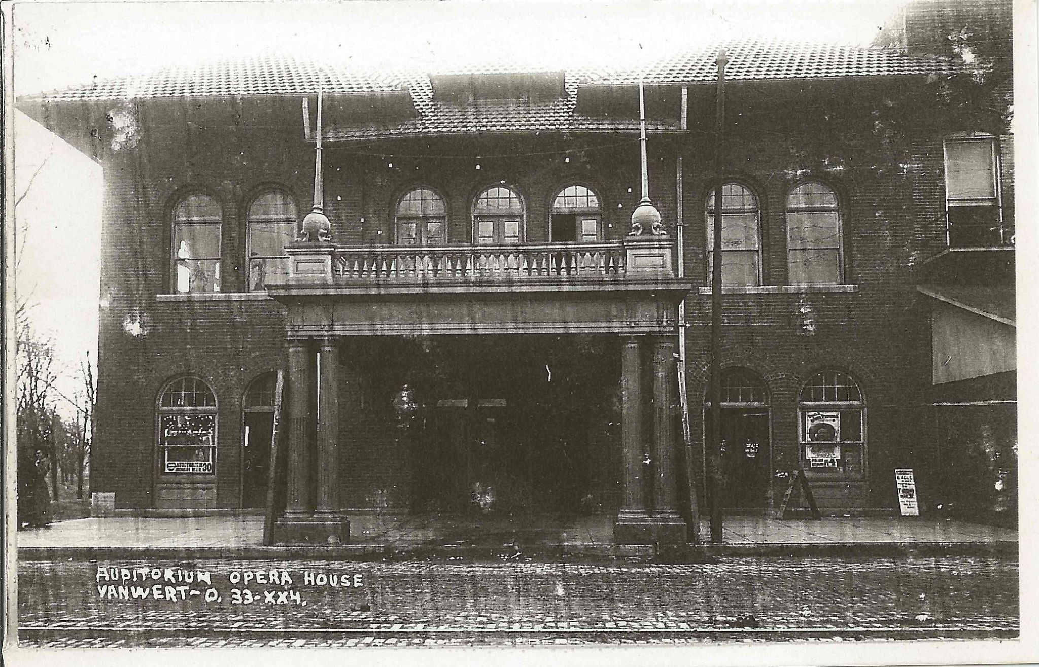 This is the Van Wert Auditorium and Opera House. Note the interurban tracks going by in the street. I believe this is Main St. just west of Washington St, or two blocks east of the CNor tracks, about a block south of the station.
