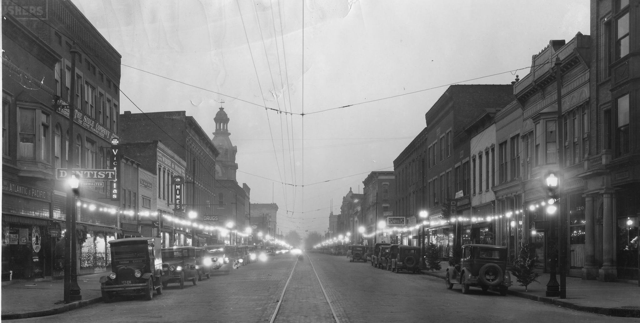 Moving around a decade or so later, downtown Van Wert is lit up during twilight. Again, the interurban tracks run down the middle.