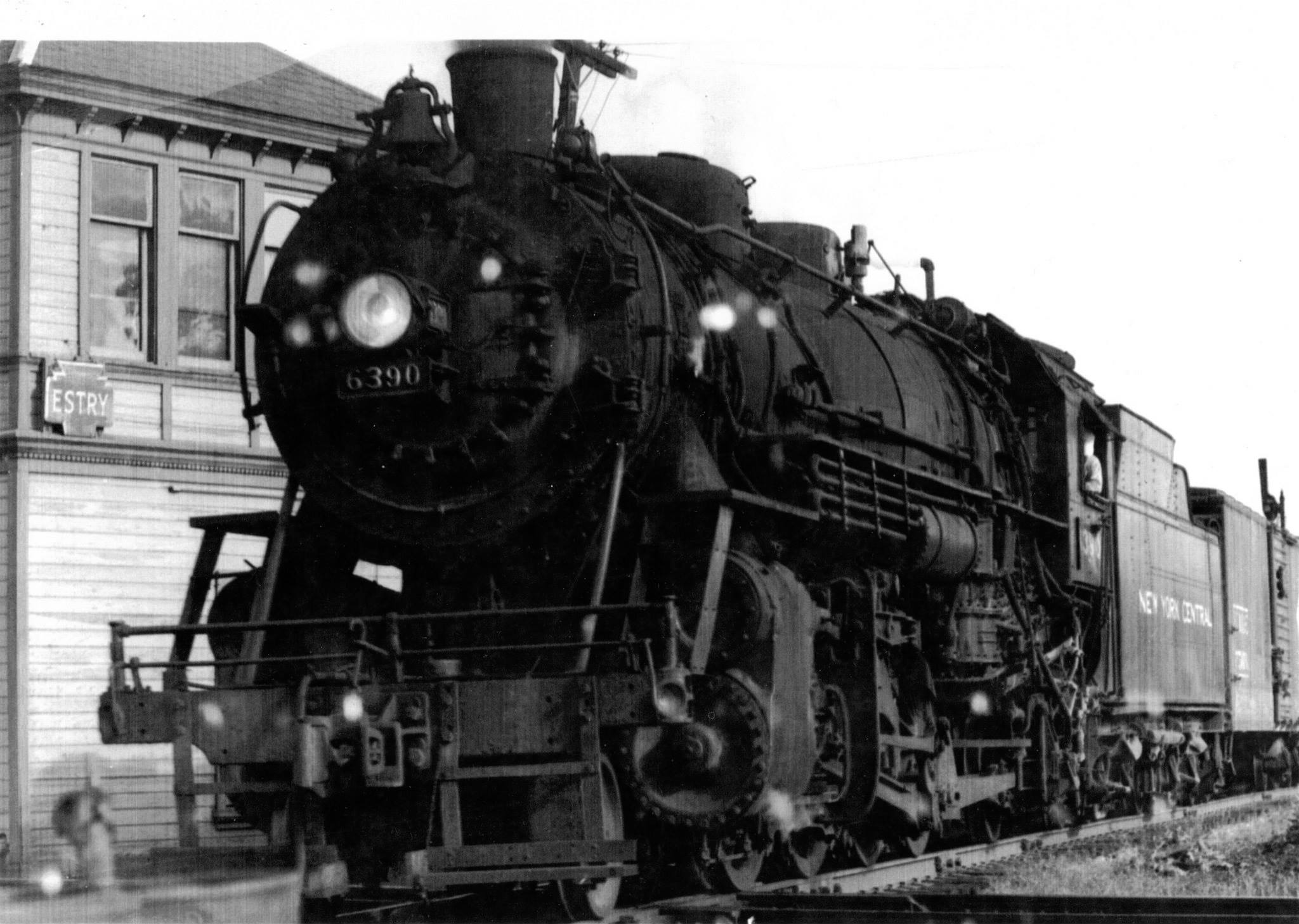 NYC (CNor) #6390, probably a class H-6a Mikado, runs past Estry tower in 1954. #6930 is another of those NYC numbering conundrums I’ve run in to. It fits the numbering scheme, but #6390 is not listed on the CNor roster. I’ll have to check to see if it was a borrowed NYC loco.