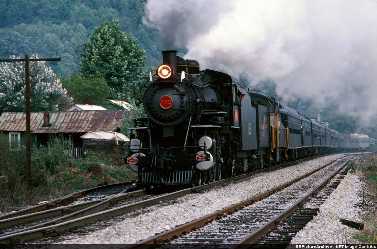 And here’s #152 in 1986 pulling a railfan train through Loyall, KY…