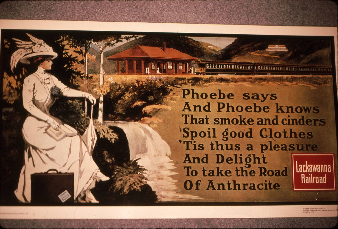 So…who was Phoebe Snow? Turns out that Phoebe Snow was a fictional character created by Earnest Elmo Caulkins to promote the Delaware, Lackawanna and Western RR. The ad campaign was one of the first to present a fictional character based on a live model. The strategy of the campaign was to promote the railroad because it burned anthracite coal (a cleaner burning coal). The advantage was that travelers would have less soot collecting on their clothes, hence the snow white dressed Phoebe Snow. Here’s a few of the ads: