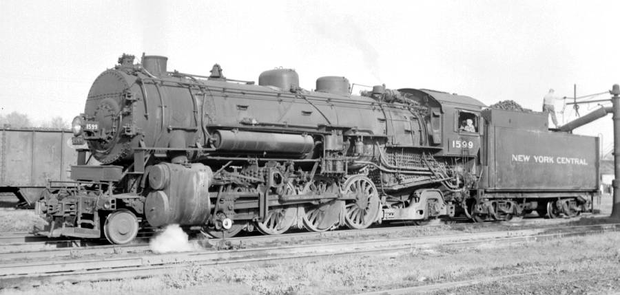 So we begin the study with a look at one of the earliest built Mikados that serviced the CNor. NYC #1599, a class H-5p Mikado, was built in 1915 (pre-USRA standards) by Alco-Brooks. Here, #1599 is taking on water at Van Wert yard in 1955. Even though #1599 was a smaller Mikado, she still had the 63” drivers common for modern Mikados. Her lines and equipment are similar though distinguishable from the classic USRA light Mikados that were standardized a few years later. Check out the non-tapered boiler and unusual front of the smoke box.