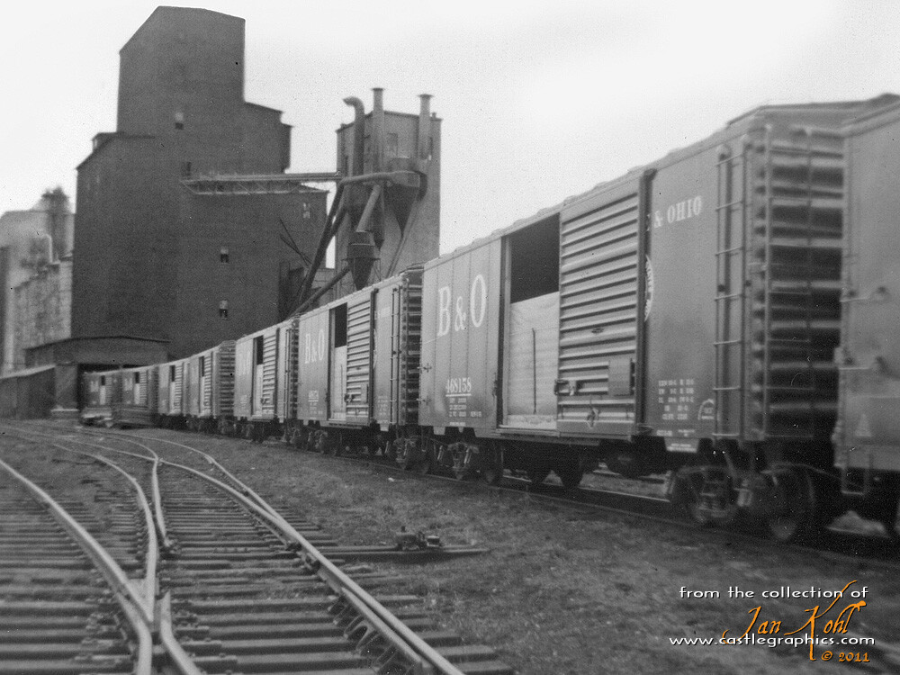As we’ve discussed in the past, grain doors were attached to the boxcars on the inside of the sliding doors as seen on this string of B&O boxcars. Grain was then dropped into the boxcar through the opening until the boxcar was filled to the top of the grain doors.