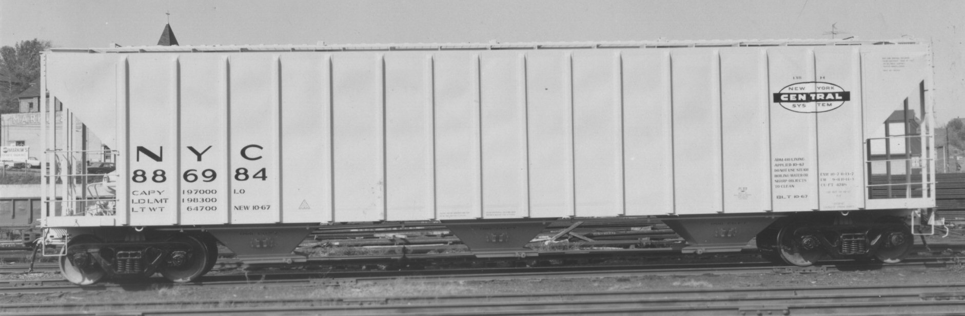 We were talking about covered hoppers and their introduction into service. The first 3-bay covered hoppers for grain service were built in 1955 by Pullman-Standard. It only has a 70 ton rating. Note the length and size compared to the 100 ton 2-bays for cement above. The grain hoppers were built larger with greater volume, but generally less weight capacity (per volume) than the 2-bay cement & sand hoppers.