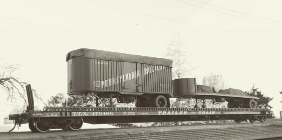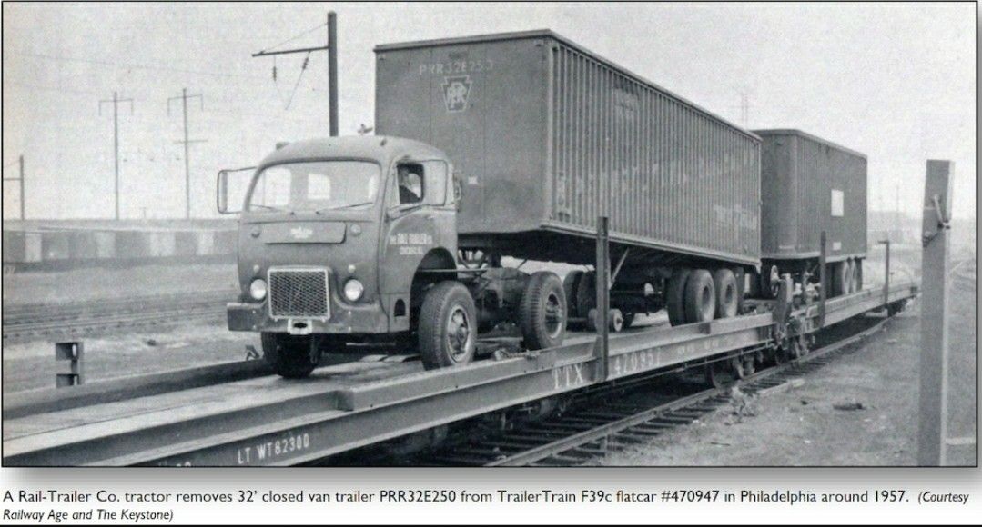 TOFC (Trailer on Flat Car), Piggyback, Intermodal, whatever it may be called – these two pics show an early Piggyback project (1940-1957) late steam / early diesel & some of the very first 85-89′ cars in 1957-1959!