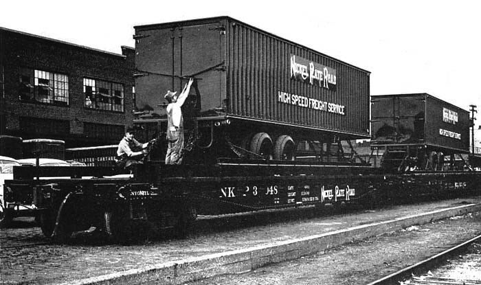 This is obviously an early container train being unloaded (or possibly loaded from the direction of the worker). I don’t have a date, but the method being used to load/unload the container is interesting. There appears to be rotating mounts on the railcar for holding the containers allowing for side-“T” access.
