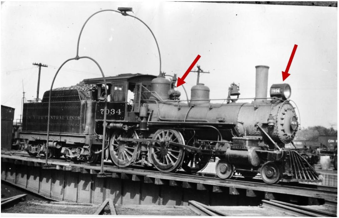 When I compared the shape of CN #110’s headlamp with common railroad headlamp parts (cast HO part listings by a reputable supplier), it came up as an arc lamp. But an arc lamp would require a generator/dynamo like the one of NYC #7034 above. There appears to be no generator on CN #110. Is this headlamp a newer style version of an oil lamp? (To match the headlamp in an HO model, I will likely purchase the arc lamp casting because it is nearly identical in shape to the headlamp shown in the picture.) Another item I noticed on the 1905 pic of CN #110 is that it appears that the fuel in the tender may be fire wood.