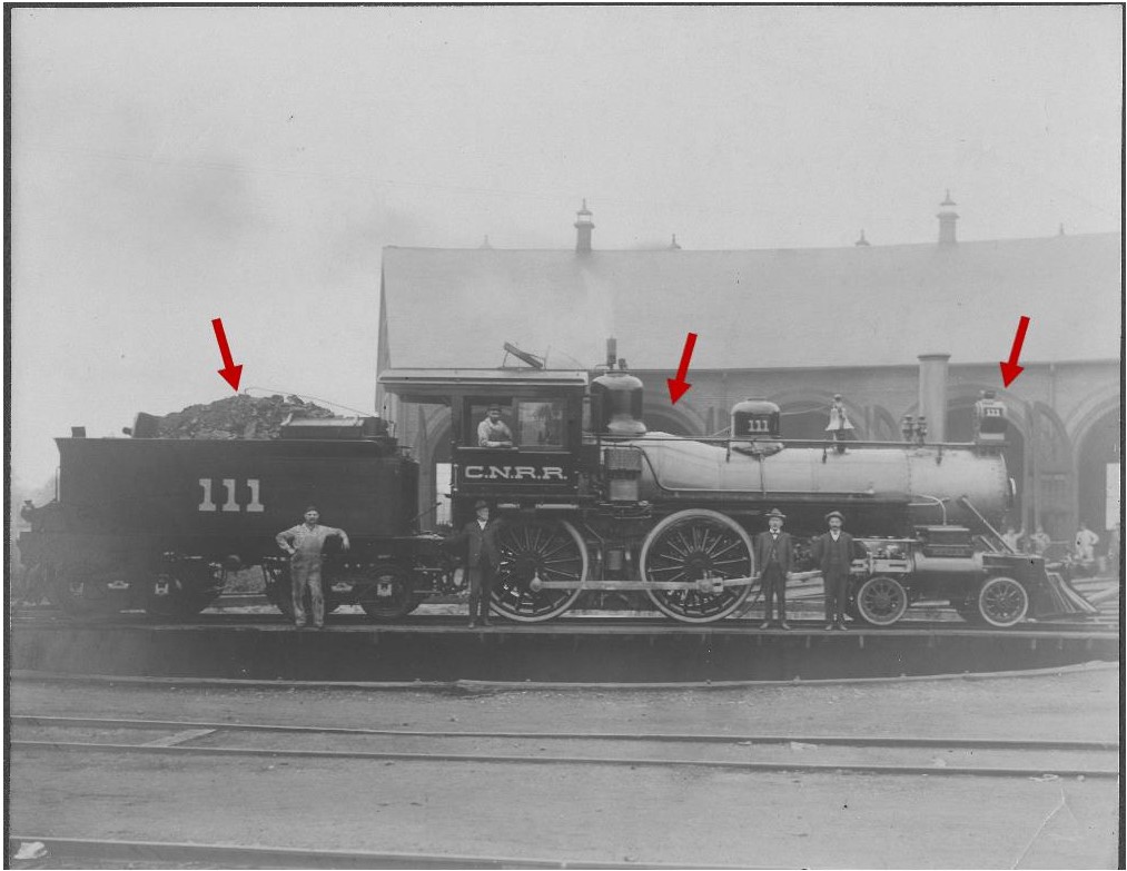 I found a photo of CN #111 while it was still numbered for the Cincinnati Northern. There are three important details to note: 1) The fuel is coal. 2) The oil headlamp in the later picture appears to be a replacement of a headlamp that resembles the arc lamp-style headlamp that was on #110! 3) There appears to be no generator/dynamo, so again, the headlamp is likely not an arc lamp, but it certainly isn’t the oil headlamp shown in the later picture!