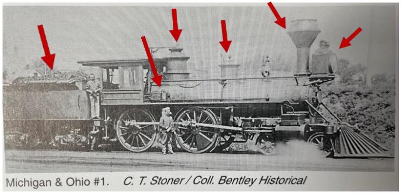 Here’s a picture of Michigan & Ohio, M&O #1 (likely taken in the mid-1880s), which ends up becoming CJ&M #16. Then it becomes CN #111—the same loco pictured above that eventually becomes NYC #7035. There appears to be coal in the tender. That’s definitely the oil headlamp expected (probably the original). It has a diamond stack that was changed out for a straight stack before the above pictures were taken. Both the steam and sand domes were modernized between the pictures. Air pumps were added later. The photo of CJ&M #12, two pictures above, shows nothing (as expected) at this spot in front of the cab on the engineer’s side. These locos were built in the early 1880’s. Air brakes were not required for interchange service until around 1900. The law passed in 1893 and allowed a 7 year grace period for upgrades. So most locomotives were upgraded with air pumps in the early to mid-1890s’s.