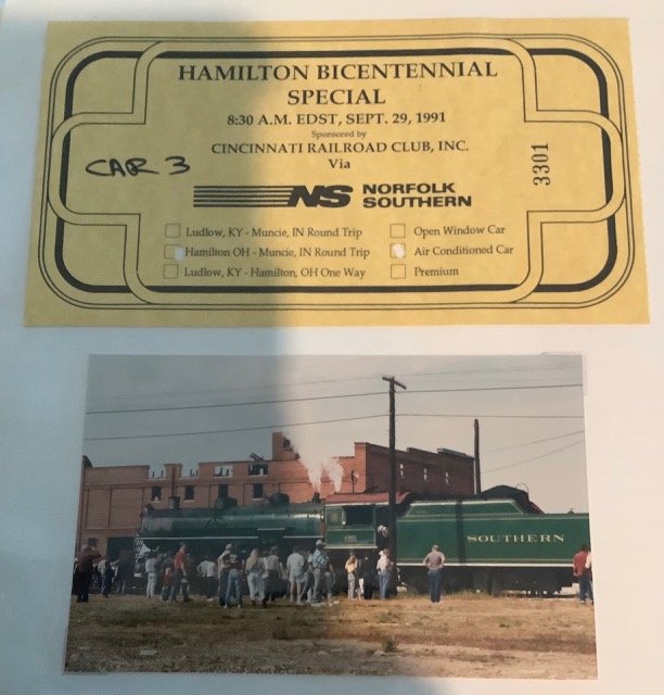 Kevin’s picture of Southern #4501 reminded me of a railfan excursion that I was on behind locomotive 4501 between Hamilton, OH, and Muncie, IN, back in 1991. I believe George played an important role in organizing that trip. The attached photo shows my ticket and the locomotive during our layover in Muncie.