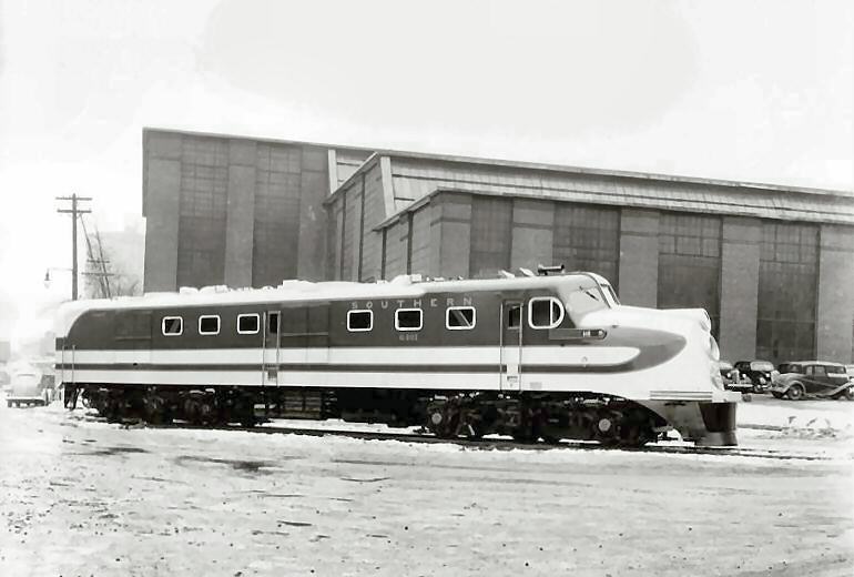 Southern’s lone streamlined steam locomotive, Ps-4 (4-6-2, Pacific) #1380, powered the Tennessean between Lynchburg and Washington, where the new train is seen in 1941. Imagine the traditional bright green & gold paint scheme with the added wide white stripe! Photograph from the Frank Clodfelter collection.