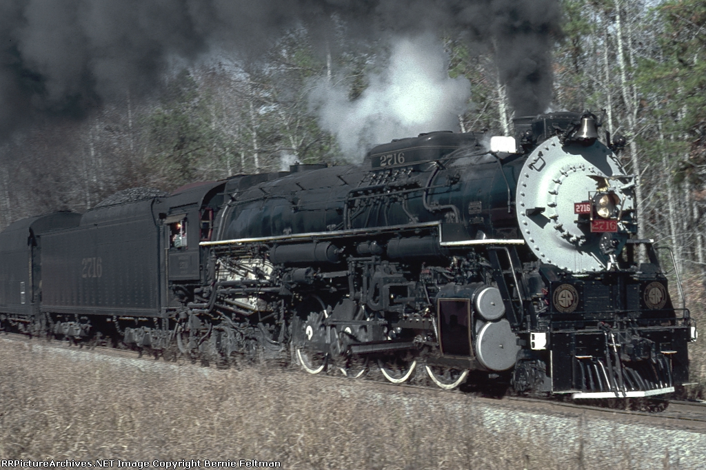 SOU #2716, a 2-8-4, runs a railfan special in 1981, Waverly, AL. It was originally built by ALCO in 1943 as C&O #2716, one of their 90 “Kanawha” type steam engines. It was painted in the Southern scheme as part of its second career as an excursion train lead. The railfan trip ran from Birmingham to Opelika, AL. Photo is by Bernie Feltman.