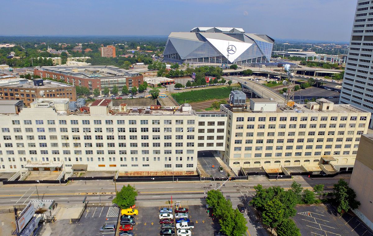Here’s three pics of Southern’s headquarters in Atlanta during some restoration of the structures. There are two main buildings – both are eight stories. But, this longer structure—connected via a multistory bridge over Nelson Street—is twice the size of its counterpart. The two brick buildings at far left are being held for future development. The Southern Railway Office is now Norfolk Southern.