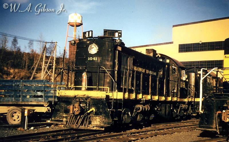 It turns out that there were two major versions of modified RS-1s: The RSD-1s with the C-C truck arrangement (above), and the RSC-1s where 3 axles trucks were added for better weight distribution, but the center axle was not powered (A1A- A1A truck arrangement). So, on the RSC-1s, speed and tractive effort were more like the RS-1s. Here’s a pic of ARR #1041, an ALCO RSC-1, at the Anchorage engine house 1956.