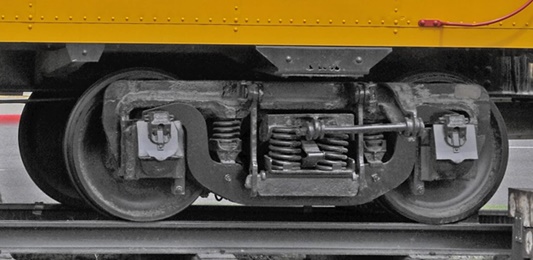 This pic gives you a great close-up of an archbar truck with leaf springs. Again, for freight service, the truck would have a couple coil springs in place of the leaf springs.