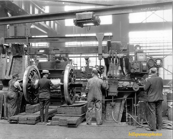 We’ve looked at shops and talked about the PRR shops in Altoona. Here is the wheel mounting machine at the Altoona shops. The guy in the suit between the drivers is measuring inside of flange to inside of flange. (I think they need a giant NWSL wheel puller and quartered along with a large NMRA gauge!)
