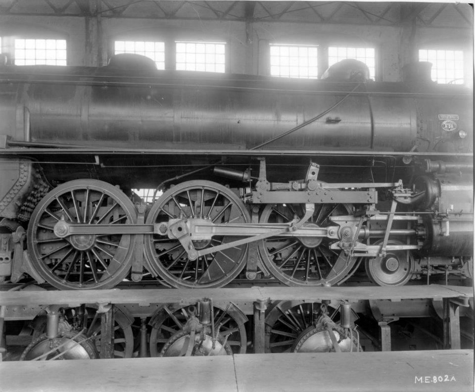 This is a similar test structure (treadmill type test configuration) at the Altoona shops. This is a PRR K29 Pacific, circa 1912. There is a structural or guard angle blocking the view of what the drivers are actually resting on, but it appears they are balanced on geared wheels below. The pilot truck (unpowered) appears to rest on a rail. My guess is that they power up the loco and the drivers roll the wheels below in the test fixture.