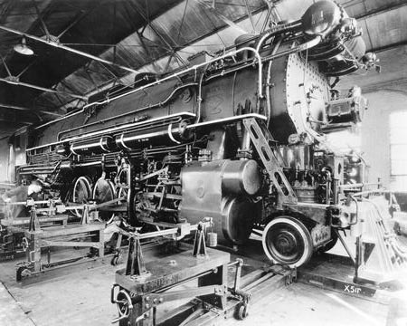 This looks like the same fixture – this photo was taken at the PRR Juniata shops, Altoona PA. That’s a PRR class K2 Pacific on the rollers (treadmill!).