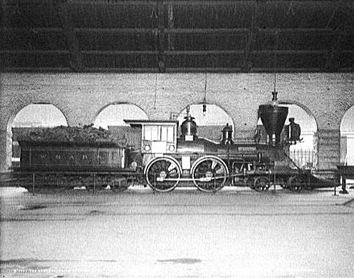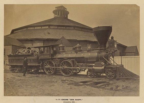 A few things caught my eye in this photo: As a classic American, 4-4-0, you can see the void between the front driver and the cylinders where the Stephenson valve gear operates. Also, the shop behind is the Alexandria Station shop (Virginia) – a traditional roundhouse where the turntable is also under roof. Here’s the caption with the pic: “This impressive machine was named for General Herman Haupt, chief of construction and transportation for the U.S. Army’s military railroads.