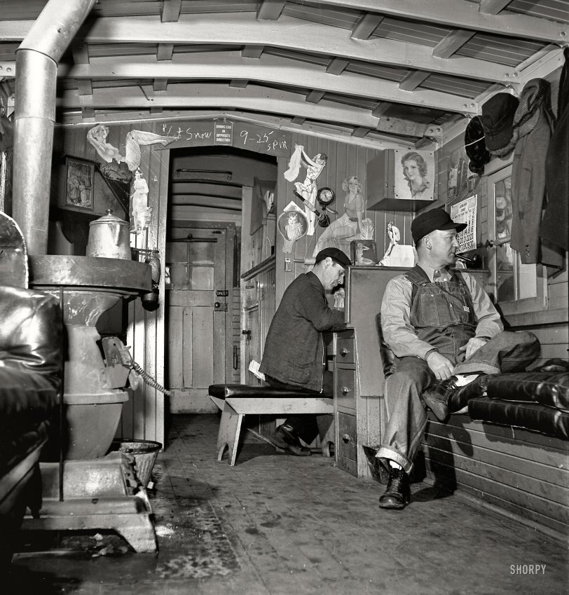 Since we’re on caboose interiors and Jack Delano photos in 1943 (for the Office of War Information), and explaining to youth the workings of the train crew – The conductor is at work at his desk while a rear brakeman gets a break to smoke his pipe. Caption on the pic explains, “The caboose is the conductor’s second home. He always uses the same one and many conductors cook and sleep there while waiting for trains to take back from division points.” The pic was taken during freight train operations on the Chicago and Northwestern Railroad between Chicago and Clinton, Iowa, 1943.