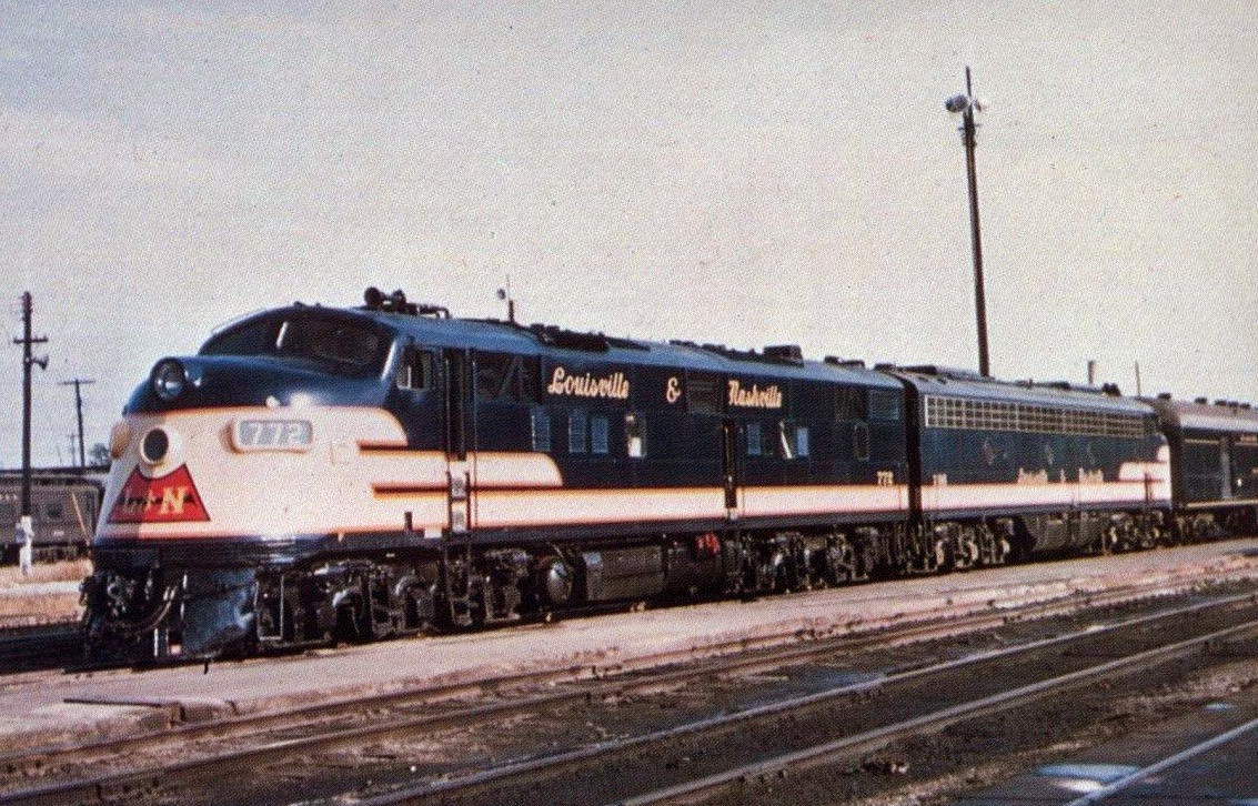 Now…I was told that in the earliest paint scheme for the “Humming Bird” motive power included a light yellow for the light area up front. But, this pic of L&N E6A #772 appears to show it as a white or possibly a cream color. #772 heads the “Humming Bird” at Louisville Union Station (Kentucky) in 1956. Howard Robins photo