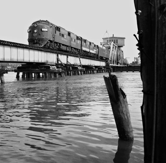 The later paint scheme worn by the Humming Bird units was the solid dark blue with yellow block lettering. This photo was taken by J. Parker Lamb, Center for Railroad Photography and Art. (Did I mention that he is one of my favorite RR photographers?) The Humming Bird is New Orleans-bound crossing the swing bridge at Pascagoula, Mississippi, in August 1958.