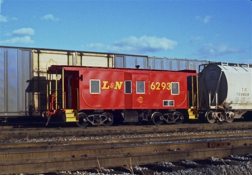 Caboose #6293 appears to have just come from the paint shop. It brings up the rear of a southbound freight leaving Yard Center in Dolton, 1976. The blue L&N 86 ft Hi-Cubes make a nice backdrop for the bright red paint. Photo by Bill Johnson.