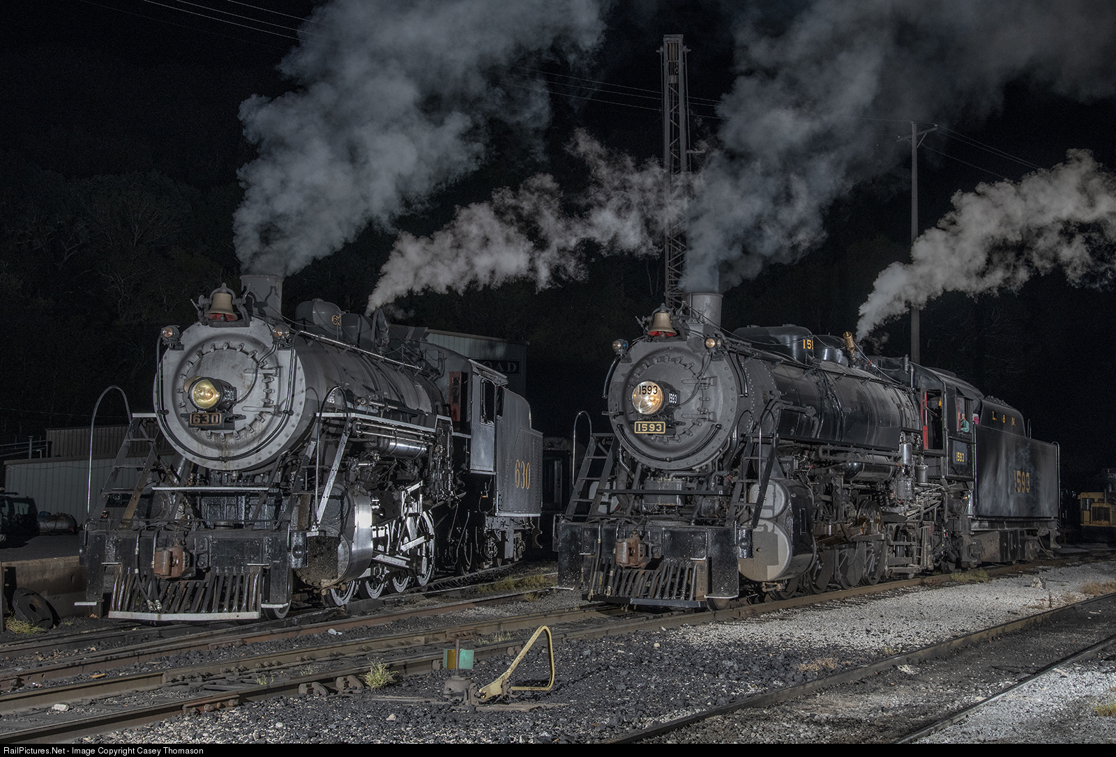 This is another pic of L&N #1593. In support of the 2019 L&N Historical Society convention being held in Chattanooga, Tennessee Valley Railroad Museum made some cosmetic changes to Southern 4501 (shown in pic as #630) to give it an Old-Reliable appearance. Here you can compare the schemes and jewelry of the two roads as “L&N J-3, 2-8-2, #1593” poses next to Southern #630 (class Ms, 2-8-2) at East Chattanooga during the Society’s night photo session. Photo is by Casey Thomason, 2019.