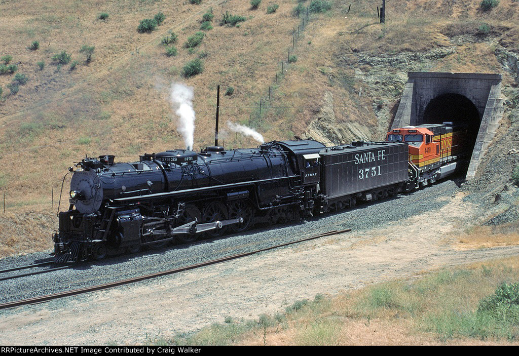 Here’s a modern pic of a restored AT&SF oil-burner – #3751, a Northern 4-8-4, class 3751 (first of this class). While the front view hides most of the tender, you can again see the “square” tender behind the loco. This is the same 20,000 gallon tender, but some of the tenders, such as this one, were equipped with roller bearing trucks for passenger service. The rivet pattern reveals the front fuel bin from the water tank.