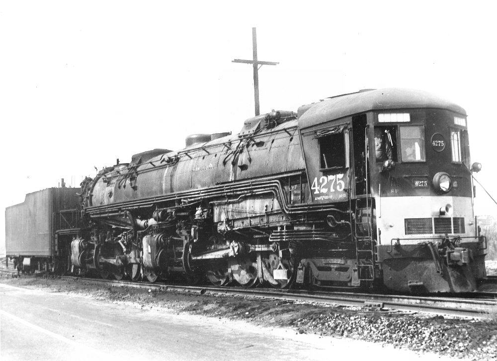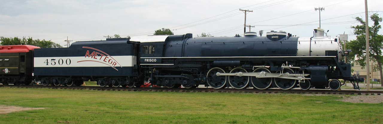 Frisco (St. Louis – San Fransisco) had some Northern 4-8-4 locos built as oil-burners. #4500 was the first of three in a series, 4500 – 4502, built by Baldwin in 1943. These three locos pulled the Frisco Meteor, a passenger train from Oklahoma City to St. Louis via Tulsa. This is a modern pic that shows #4500 with a long haul tender that appears to have an oil tank insert in the coal bin. The oil tank insert could carry 6,500 gallons of oil along with the 18,000 gallons of water in the standard water tank.