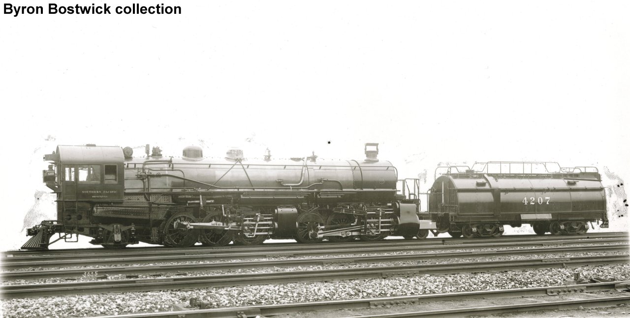 The SP cab-forwards were oil-burners (with the firebox at the front of the locomotive, there was no convenient way to fire it with coal). #4207 was provided with a “whaleback” tender which was made with larger capacities for both oil and water.