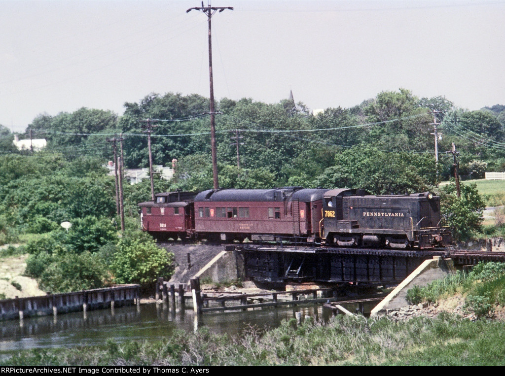 Another great pic shows #497125 taken near Lewes, Delaware, during June of 1967. Prominent here is Pennsylvania Railroad engine #7862, a BS-6A switcher built by the Baldwin Locomotive Works as number “5962” in March of 1948, rated at 660 horsepower, and renumbered “7862” in preparation for the PRR-NYC merger. In this context, it’s pulling PRR Clearance Car #497125.